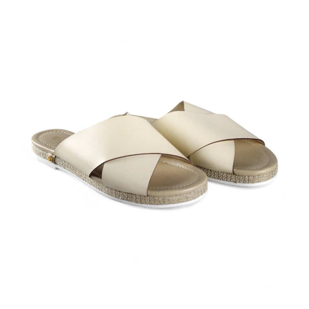 DESCRIÇÃO: Essa rasteira off white é sinônimo de elegância minimalista e conforto. O modelo apresenta tiras largas cruzadas na parte frontal, que garantem firmeza e um visual moderno. Possui palmilha macia e solado com detalhe trançado em tom natural, trazendo um toque artesanal e sofisticado. O pequeno aplique dourado na lateral adiciona um charme discreto. Ideal para compor produções leves e refinadas, é perfeita para o dia a dia ou para momentos de lazer com estilo.