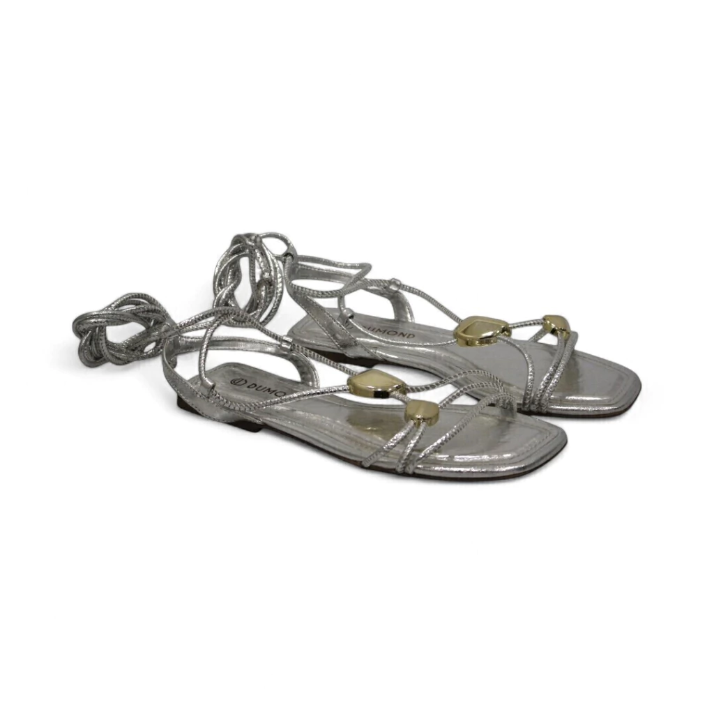 DESCRIÇÃO: A imagem mostra uma rasteira prateada da marca Dumond, com um design moderno e sofisticado. O modelo apresenta tiras finas metalizadas que se entrelaçam delicadamente sobre o pé e se amarram ao tornozelo, proporcionando ajuste confortável e elegante. Na parte frontal, dois adornos metálicos dourados adicionam contraste e um toque de brilho sutil. A palmilha quadrada e o acabamento metalizado reforçam o estilo contemporâneo, ideal para produções casuais ou mais refinadas.