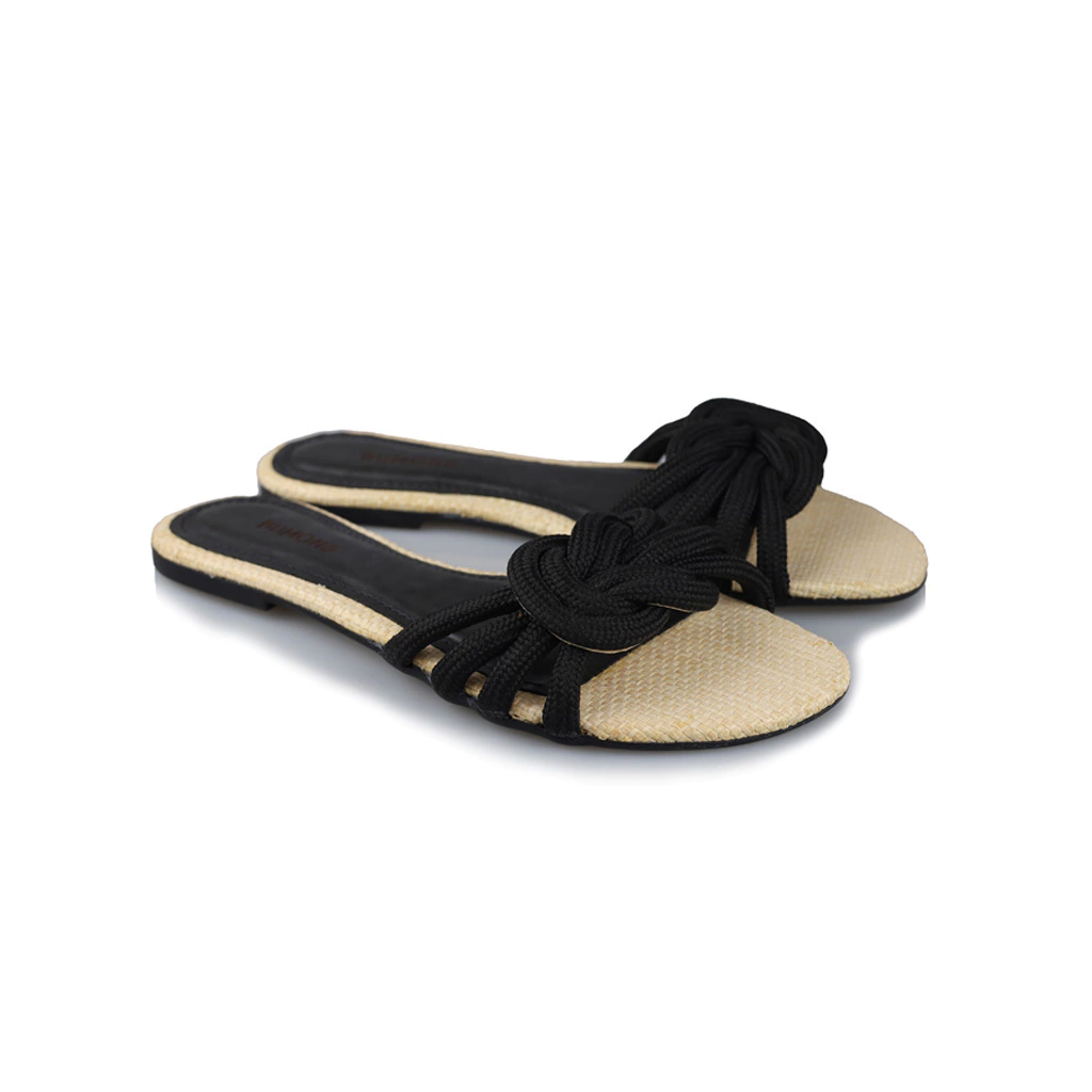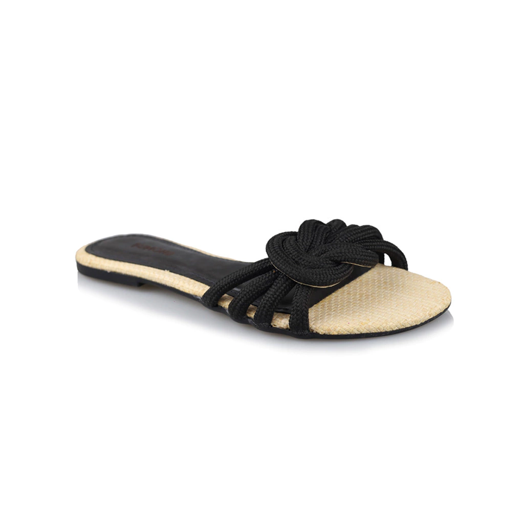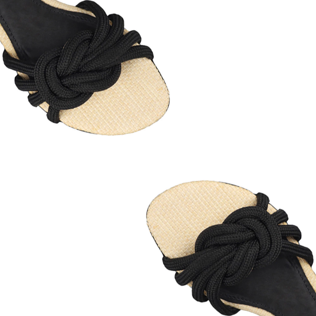 As sandálias possuem um design descontraído e contemporâneo, com tiras em preto que se entrelaçam de forma elegante. A parte frontal conta com um detalhe em formato de nó, feito de corda, que adiciona um toque de estilo. O solado é em tom claro, imitando palha, que aporta um contraste interessante e um aspecto leve. Com um formato aberto e sem salto, essas sandálias são perfeitas para dias quentes e ocasiões informais, garantindo conforto e um visual moderno.