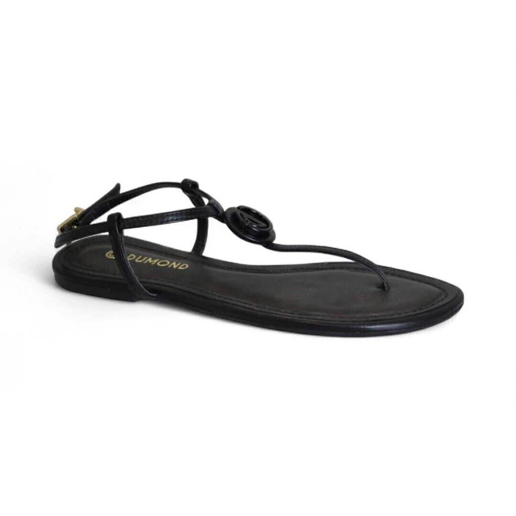 DESCRIÇÃO: A imagem mostra uma rasteira preta da marca Dumond, com design minimalista e elegante. O modelo apresenta tiras finas que se cruzam delicadamente sobre o pé e se ajustam ao tornozelo com fivela dourada. No centro, traz um detalhe circular com o logo da marca, adicionando um toque sofisticado. A palmilha é lisa e o solado baixo garante conforto e praticidade, ideal para compor looks leves e modernos no dia a dia.
