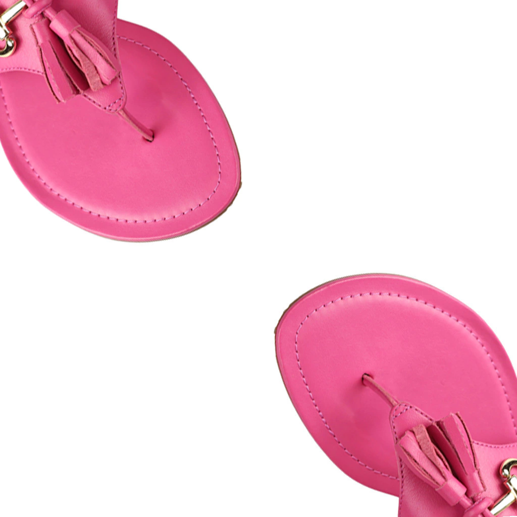 Esta sandália de dedo é uma escolha vibrante e divertida para os dias quentes. Com um tom rosa chamativo, ela se destaca pelo design elegante e moderno. A parte frontal conta com detalhes em laço e anéis dourados, que adicionam um toque de sofisticação. A tira entre os dedos oferece conforto, enquanto a sola plana garante facilidade ao caminhar. Ideal para compor looks casuais, essa sandália pode ser usada com shorts, saias ou vestidos, tornando-a perfeita para passeios, praias ou eventos informais. É uma peça que traz um ar alegre e descontraído ao visual.