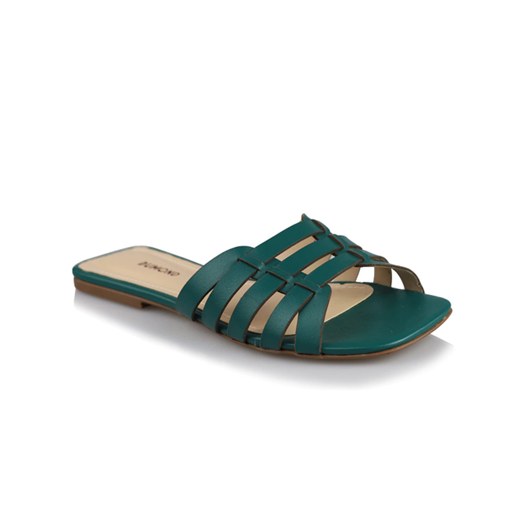 As sandálias possuem um design moderno e descontraído, em um tom verde vibrante que chama a atenção. A parte superior é composta por várias tiras que se cruzam, criando um efeito entrelaçado que proporciona ventilação e estilo. O modelo é aberto na frente, com uma sola plana que oferece conforto para o uso diário. A palmilha é acolchoada, garantindo uma experiência agradável ao caminhar. Essas sandálias são ideais para dias quentes e ocasiões casuais, unindo praticidade e um toque contemporâneo de forma harmoniosa.