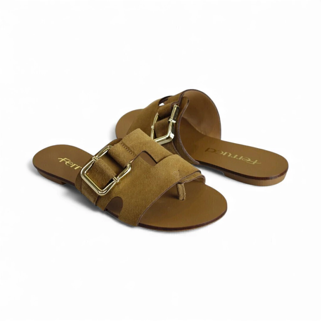 DESCRIÇÃO:Rasteira feminina tipo slide, com uma única tira frontal. Confeccionada em camurça/camurçado na cor verde oliva/cáqui. A tira frontal apresenta uma fivela retangular dourada como detalhe decorativo. Solado fino e liso em tom marrom. Estilo casual e confortável, adequado para uso no dia a dia.