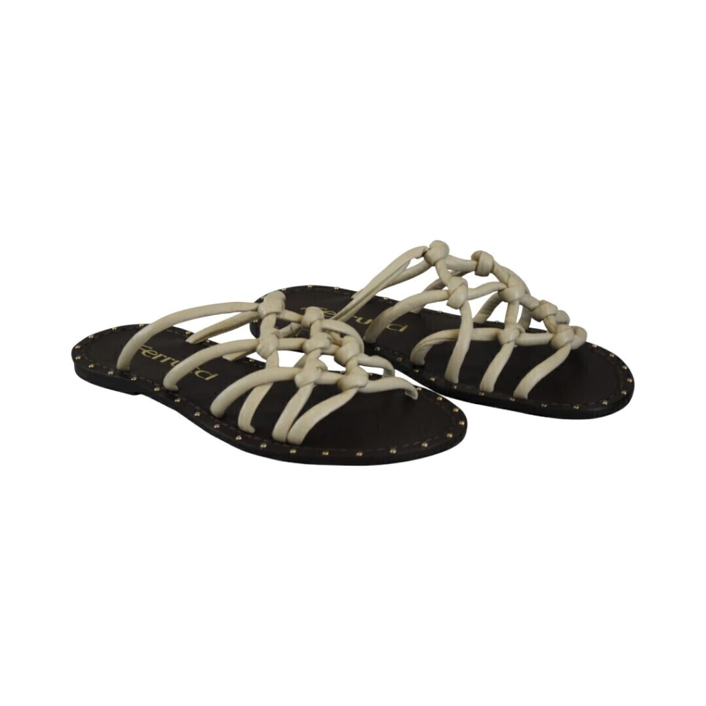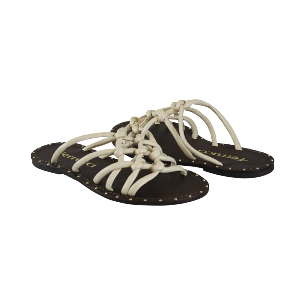 DESCRIÇÃO:Rasteira feminina em tom creme/ivory com sola marrom escura fina. Cabedal composto por várias tiras finas entrelaçadas e com nós decorativos formando uma trama sobre o peito do pé; modelo aberto, sem tira de calcanhar. Borda da sola com pequenos tachas dourados e pesponto contrastante. Visual delicado e casual, ideal para uso diário.