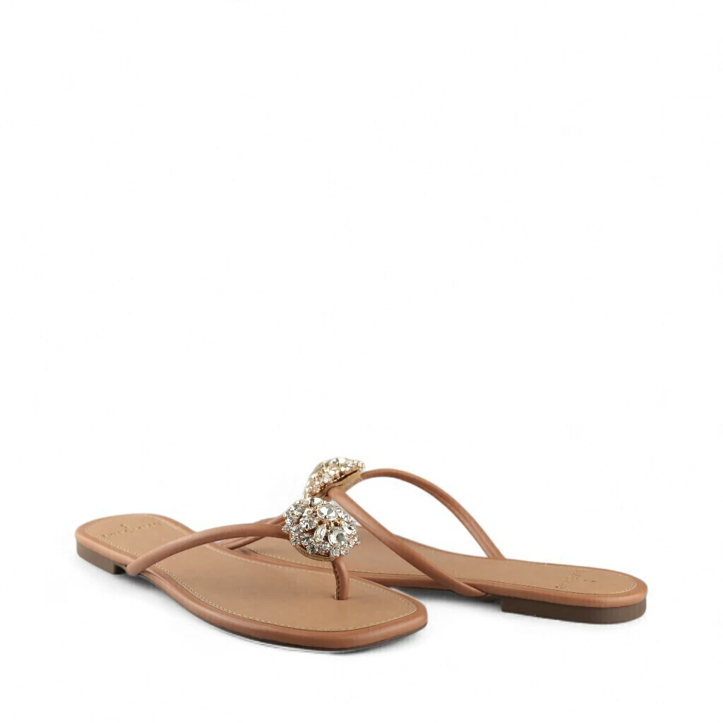 Descrição: A imagem mostra uma sandália feminina de dedo com design delicado. A parte superior possui um enfeite em forma de flor, decorado com strass brilhantes. O tom bege suave a torna versátil para diversas combinações. Com sola plana, é confortável e ideal para uso diário e eventos informais, unindo elegância e praticidade.