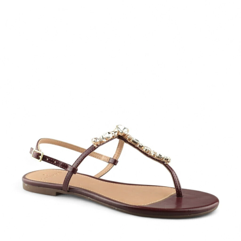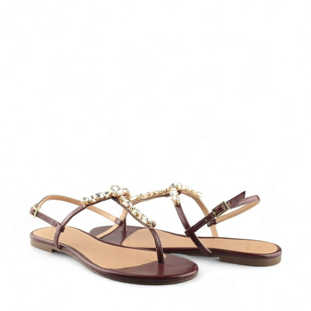 Descrição: Sandália rasteira em tom bordô com sola plana e palmilha levemente acolchoada. Modelo em T com tiras finas e aplicação de pedras brilhantes ao longo da tira central, trazendo um acabamento sofisticado. Possui tira ajustável no tornozelo com fivela dourada e design minimalista, ideal para looks sociais ou casuais arrumados.