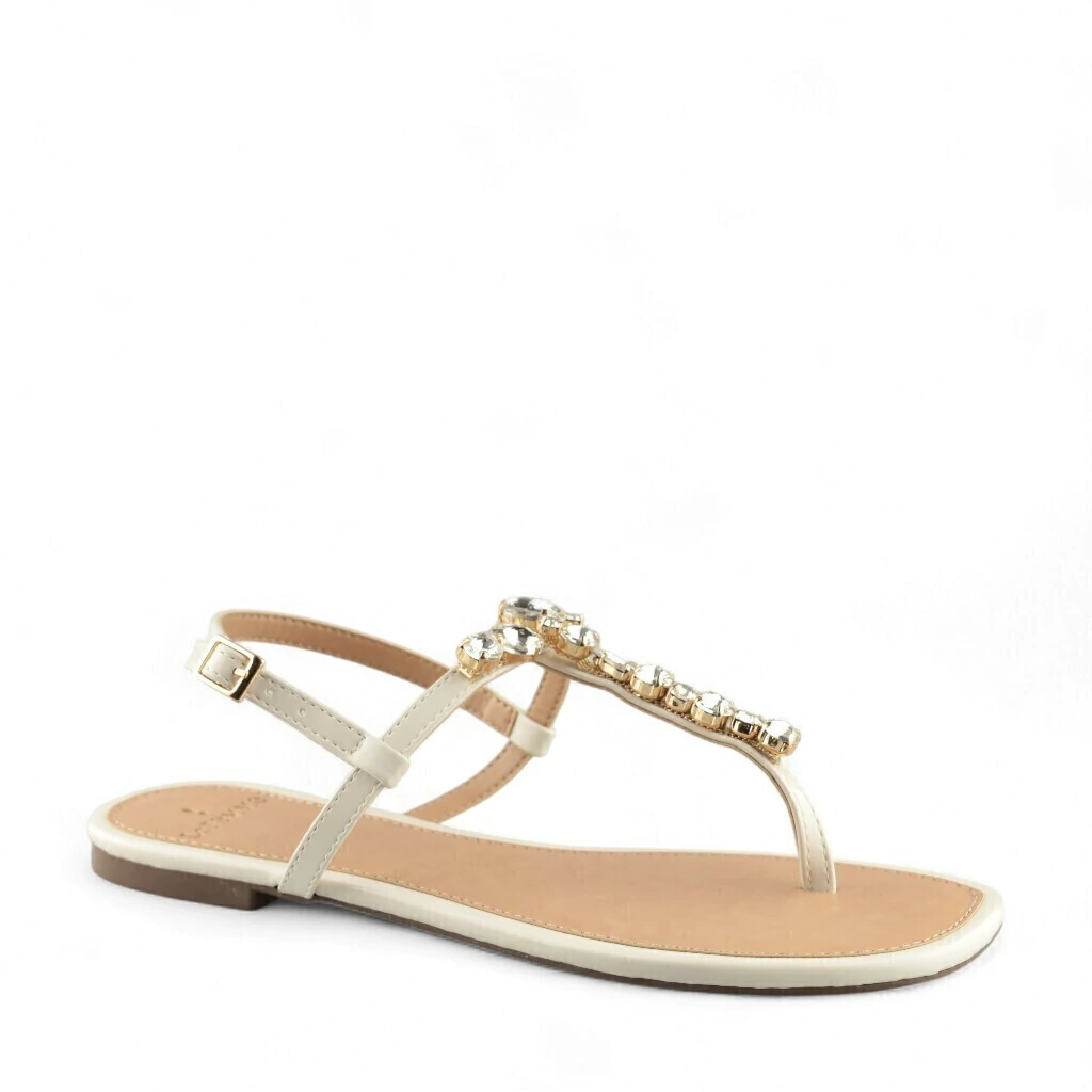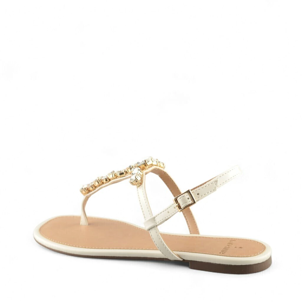 Descrição: A imagem apresenta um par de sandálias abertas em um tom creme. O design conta com tiras finas que se cruzam sobre o pé, destacando um detalhe decorativo de pedras brilhantes na parte frontal, que adiciona um toque de sofisticação. A tira no tornozelo é ajustável com uma fivela, proporcionando um ajuste seguro. A sola é plana, garantindo conforto para o uso diário. Essas sandálias são versáteis e podem ser usadas em diversas ocasiões, desde passeios informais até eventos mais elegantes, combinando bem com diferentes estilos de roupas.
