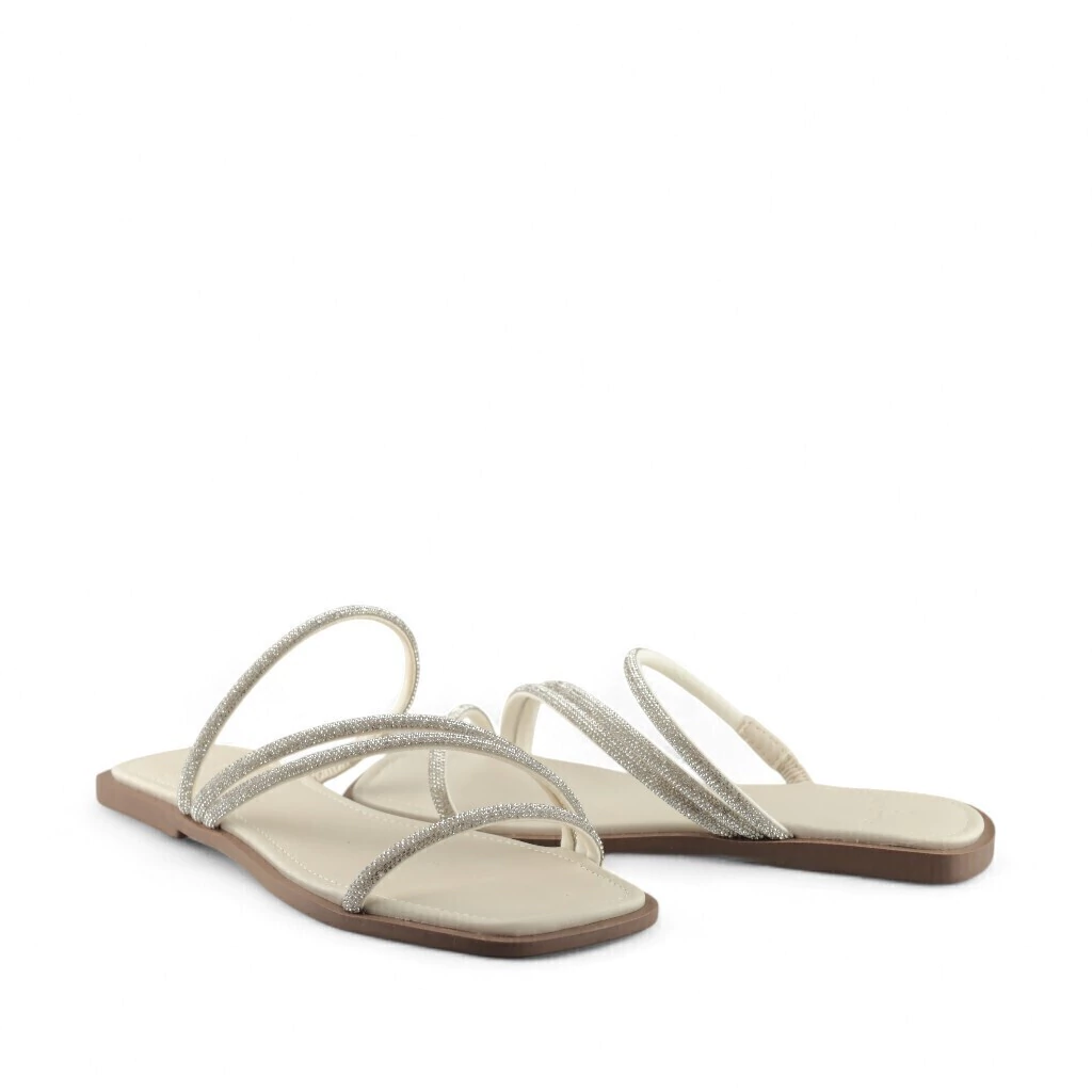 Descrição: A imagem mostra uma sandália feminina de estilo moderno e elegante. O modelo apresenta uma sola plana e é adornada com tiras finas que possuem um acabamento brilhante ou metalizado. As tiras cruzam-se em cima, proporcionando um design delicado e estiloso. A palmilha é de cor clara, enquanto a sola é de um tom marrom mais escuro, criando um contraste visual. Este tipo de sandália é ideal para ocasiões casuais ou semi-formais, combinando conforto e sofisticação.