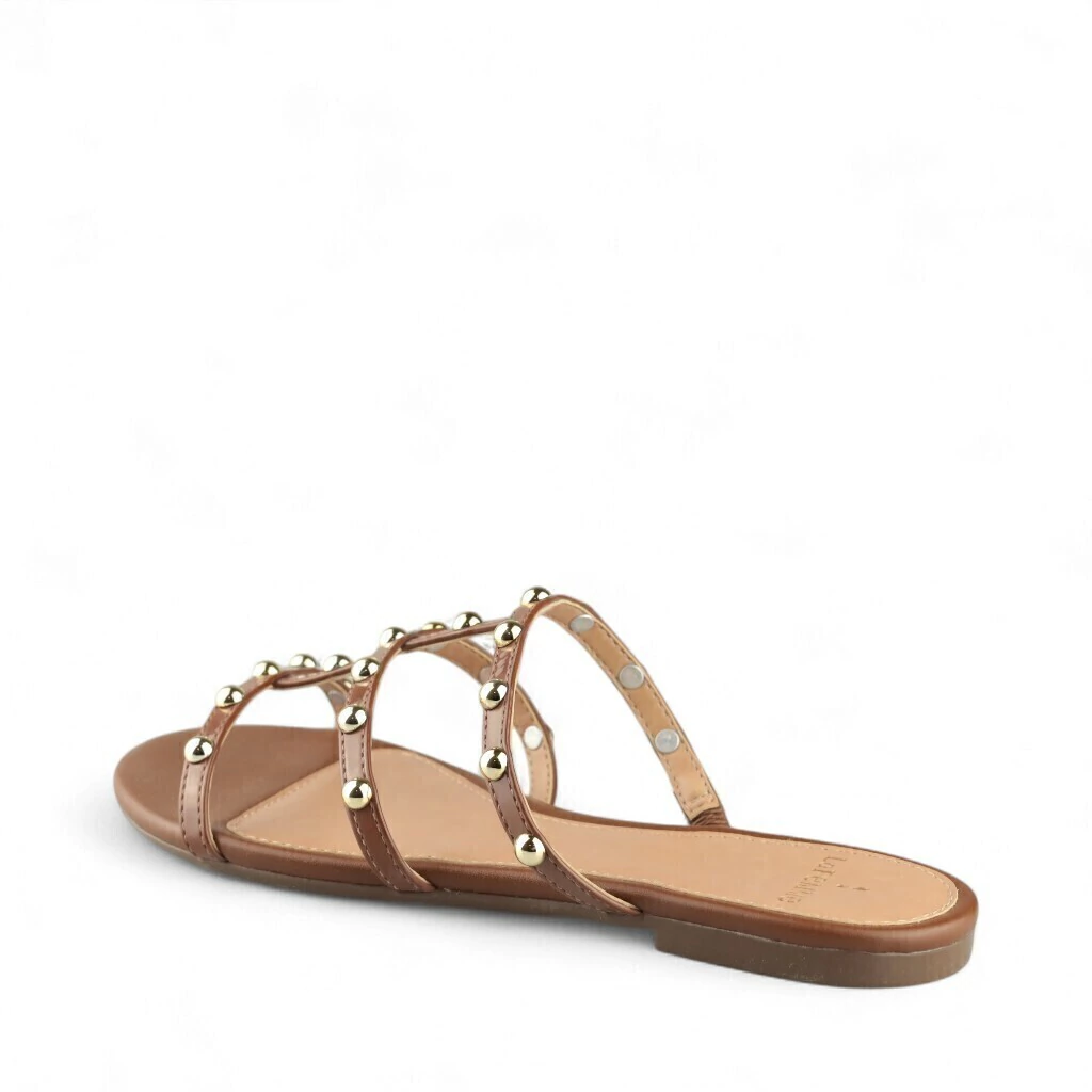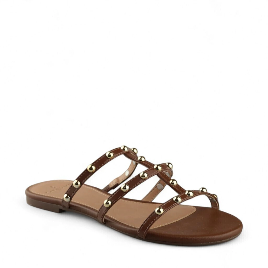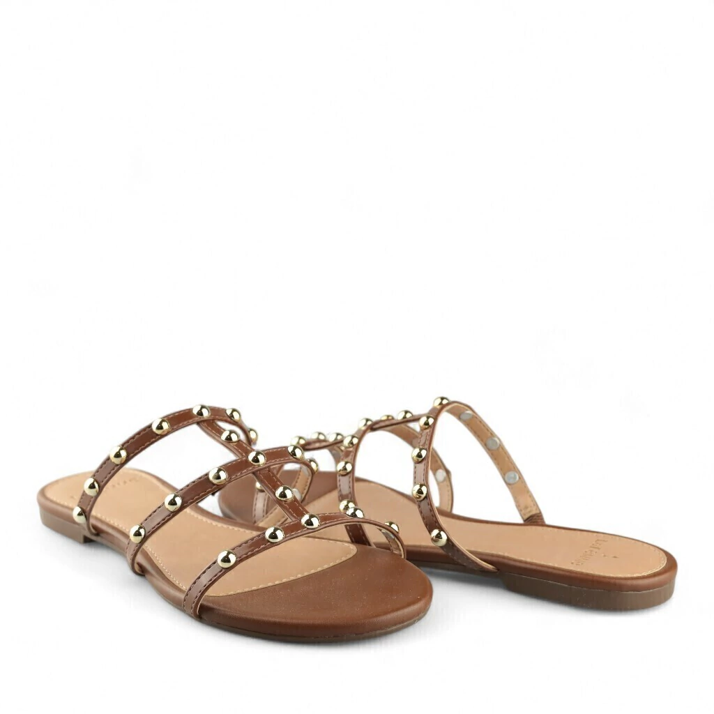 Descrição: A imagem mostra uma sandália feminina aberta, de cor marrom, com um design moderno. A parte superior é composta por tiras cruzadas decoradas com pequenas esferas metálicas que acrescentam um toque de estilo.