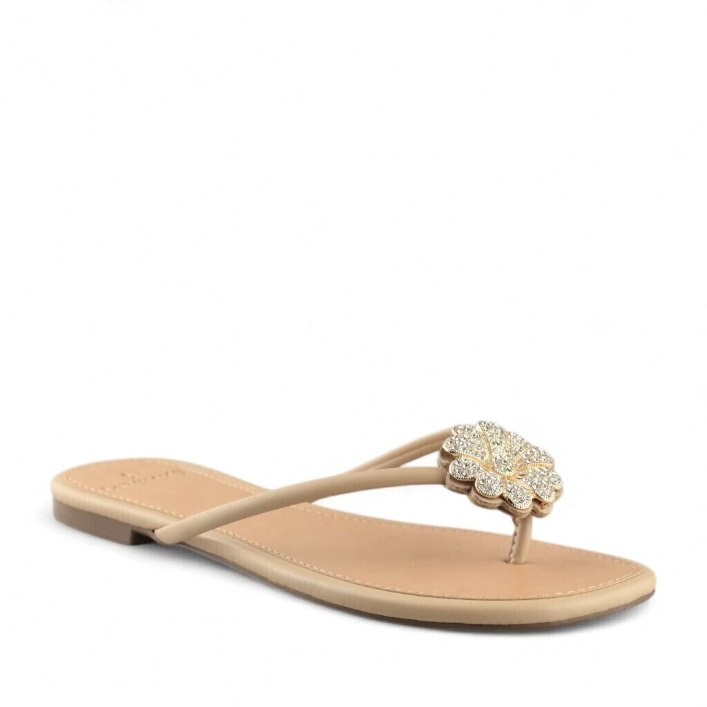 Descrição: A imagem apresenta uma sandália feminina de dedo com um design delicado. A parte superior é decorada com um enfeite em forma de flor, que brilha com detalhes em strass, conferindo um toque de glamour. O tom da sandália é neutro, em um bege suave, que combina bem com diversas roupas. A sola é plana e parece ser feita de material confortável, ideal para uso casual em dias quentes. O estilo é elegante e versátil, perfeito para eventos informais ou saídas descontraídas.