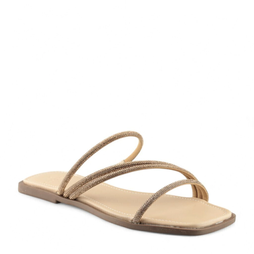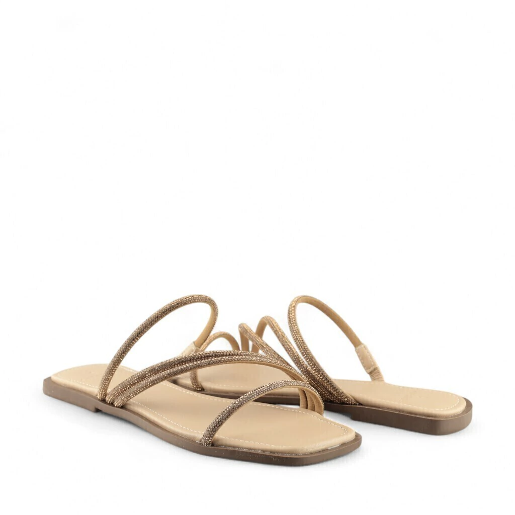 Descrição: A imagem apresenta um par de sandálias rasteiras em um tom neutro. O design é minimalista e elegante, com duas tiras finas em um tom dourado que se cruzam sobre o pé, criando um visual delicado. A sola é plana, proporcionando conforto e facilidade ao caminhar. Essas sandálias são versáteis e ideais para o uso diário, podendo ser combinadas com diferentes estilos de roupas, desde looks casuais até mais arrumados, trazendo um toque sutil de sofisticação ao visual.