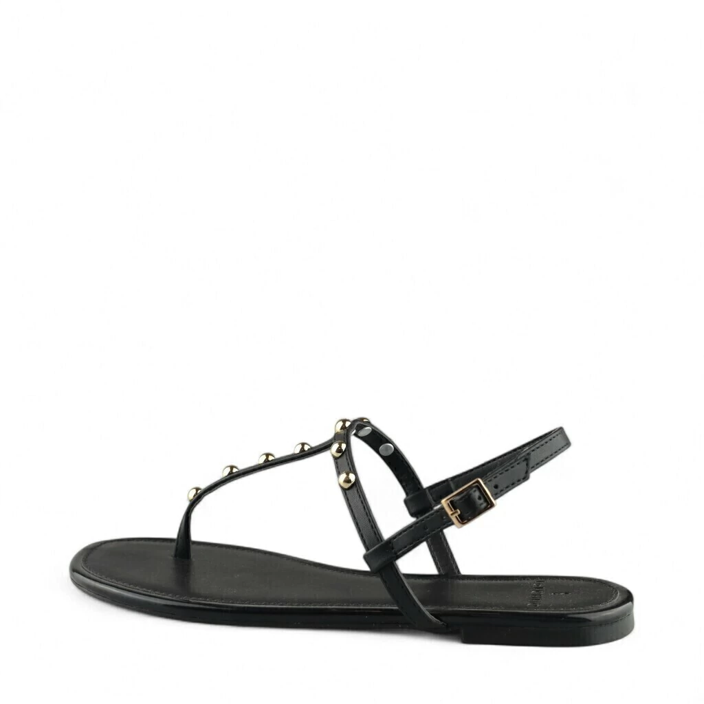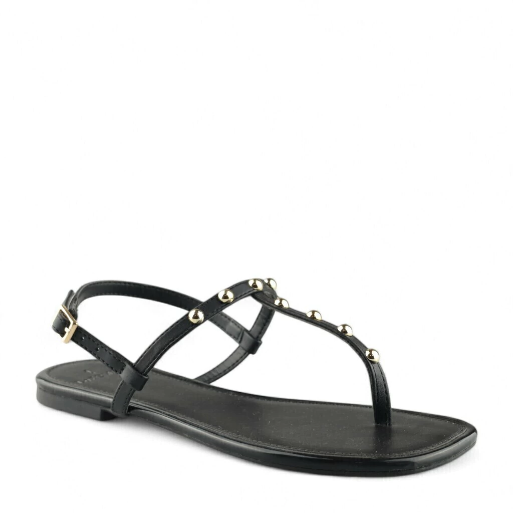Descrição: Sandália rasteira preta com sola plana e palmilha levemente acolchoada. Tiras finas em formato em T que se cruzam sobre o peito do pé e seguem até o dedão, decoradas com pequenas tachas/esferas metálicas douradas. Tira ajustável no tornozelo com fivela dourada. Visual minimalista e elegante, versátil para looks casuais e mais arrumados.