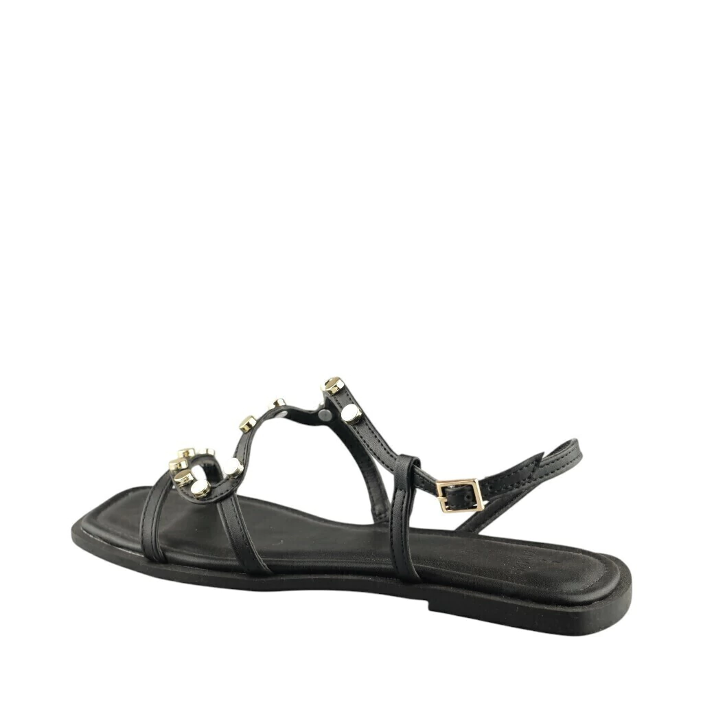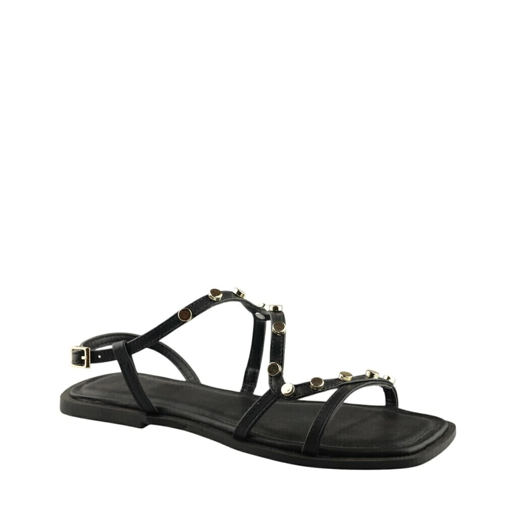 Descrição: A imagem apresenta um par de sandálias abertas em tom preto. As sandálias possuem várias tiras finas que se cruzam sobre o pé, com detalhes em pequenas bolinhas metálicas que adicionam um toque de estilo. Há uma tira no tornozelo com fivela para um ajuste seguro. A sola é plana, proporcionando conforto. O design moderno e elegante torna essas sandálias versáteis, adequadas para diversas ocasiões, desde passeios informais até eventos mais sofisticados.