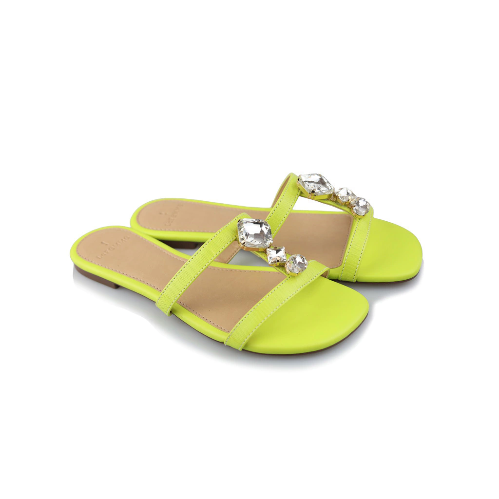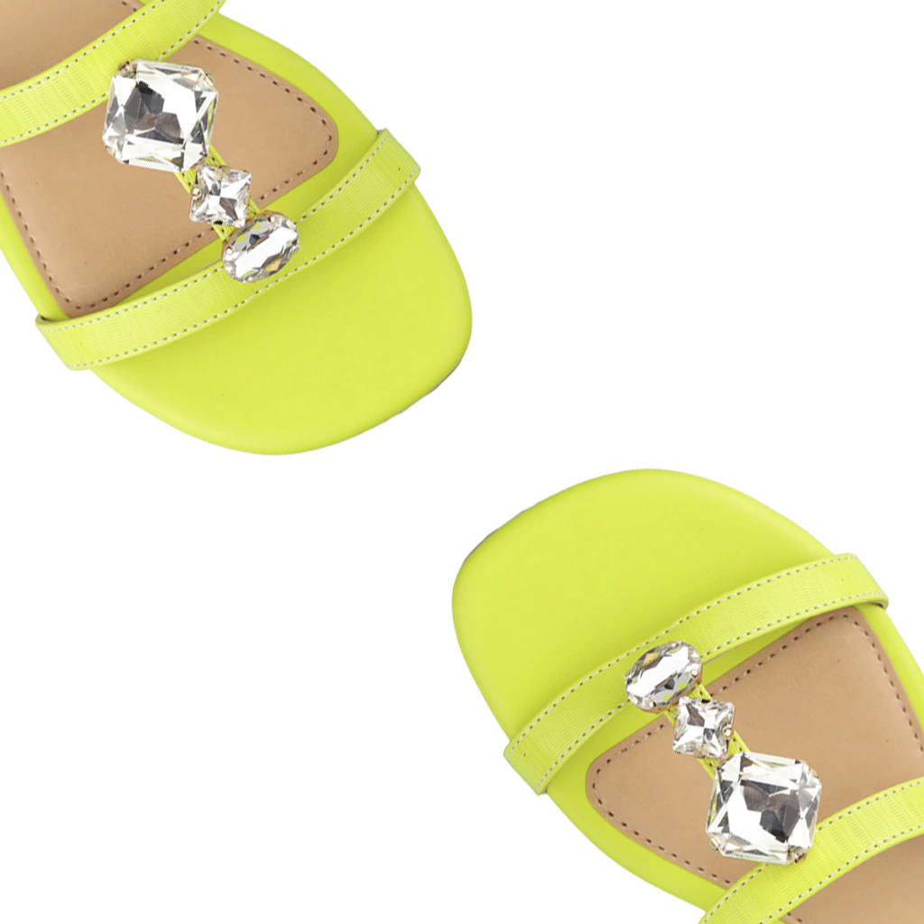 sta é uma sandália slide vibrante e moderna, ideal para quem busca conforto e estilo. Com um tom amarelo limão, ela se destaca pela sua cor alegre e ousada. O design apresenta tiras duplas, que oferecem um suporte leve, e é adornada com pedras brilhantes que acrescentam um toque de sofisticação e glamour.