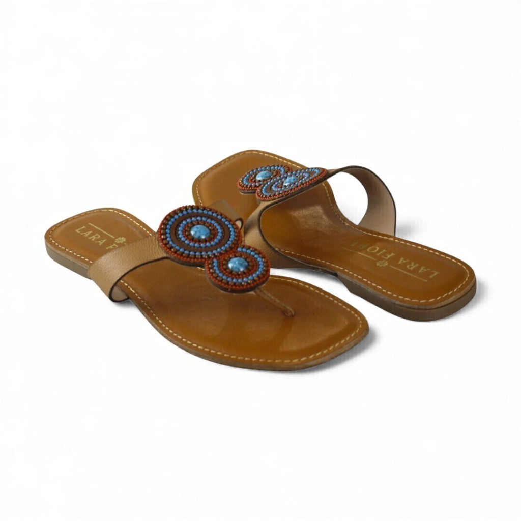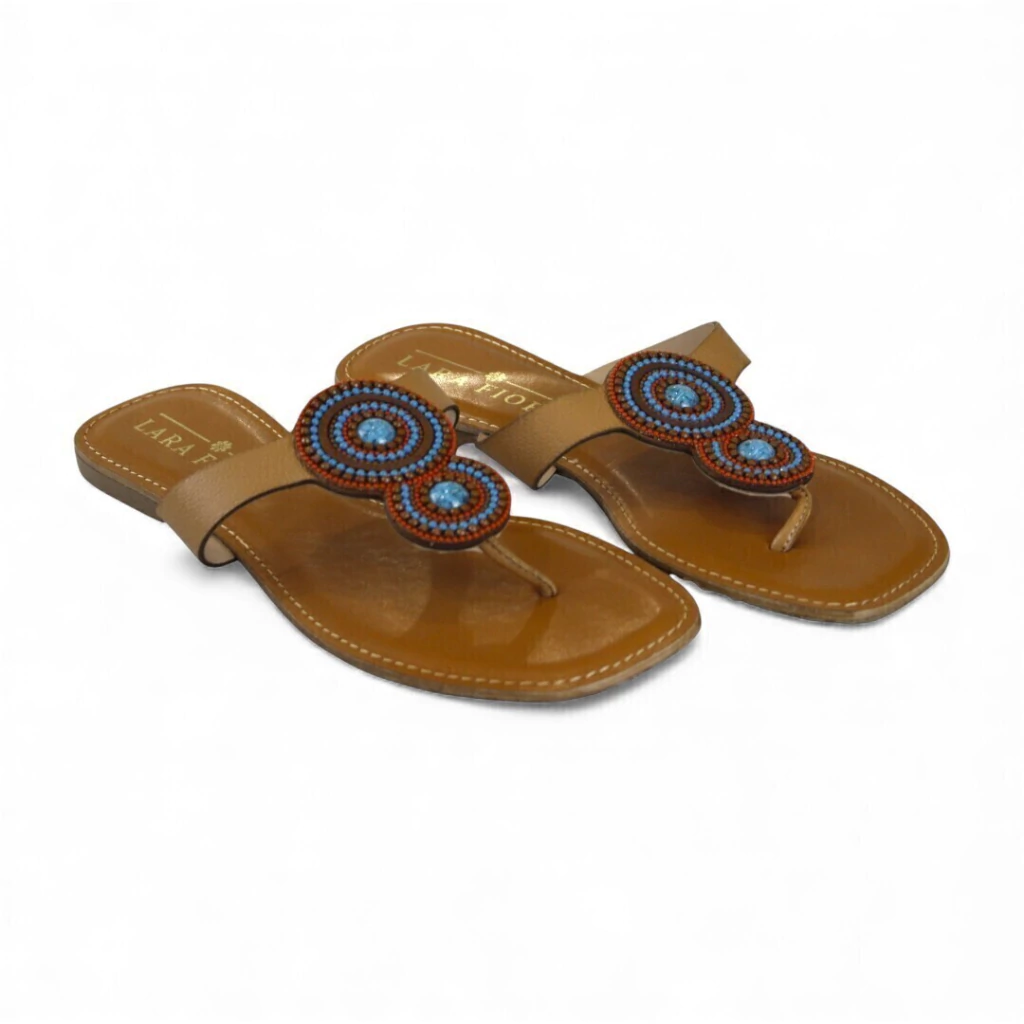 DESCRIÇAO: Uma sandália feminina rasteira tipo thong/rasteira em tom marrom caramelo com palmilha acolchoada e costura aparente na borda. Possui tira larga sobre o dorso do pé e entre o dedão um tirante fino. Na parte superior há enfeite duplo circular bordado com miçangas em tons de azul e marrom, com pedras azuis no centro. Visual casual, boho e elegante para uso diário.
