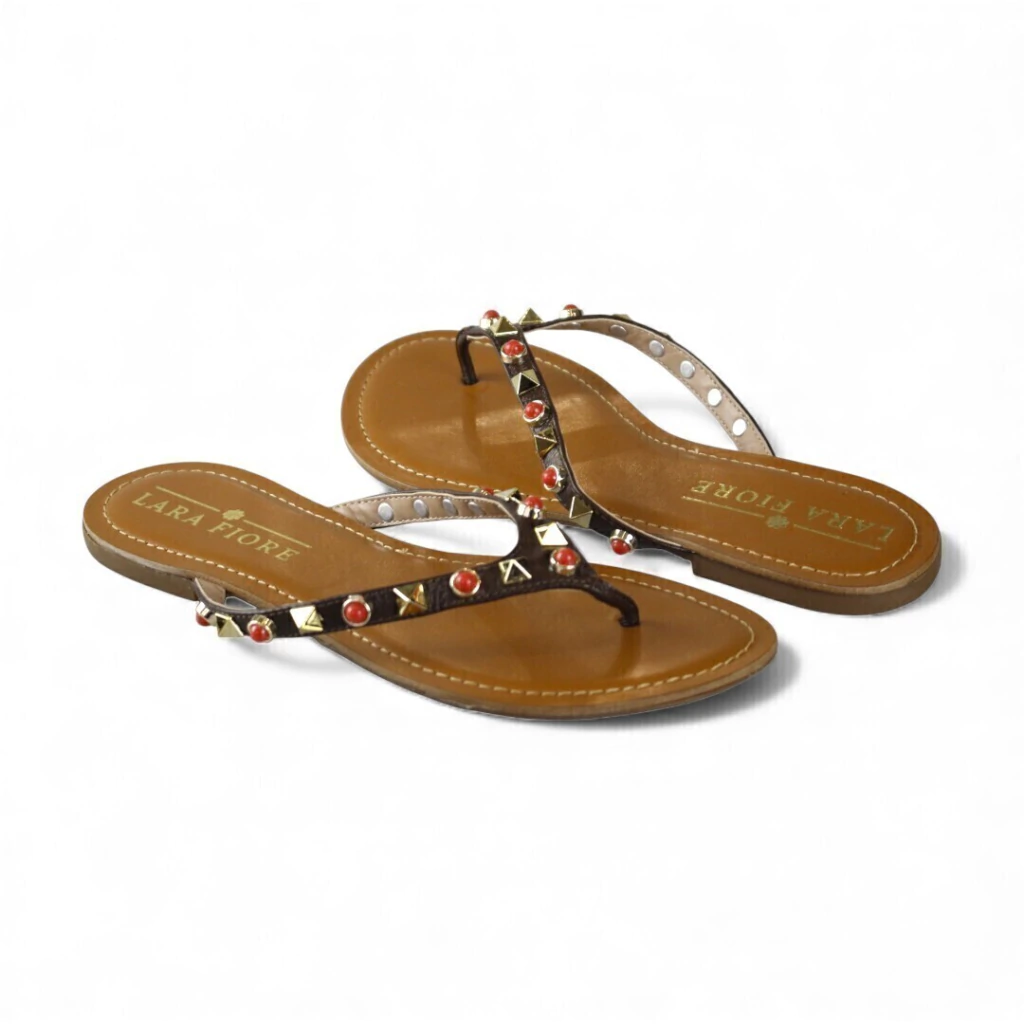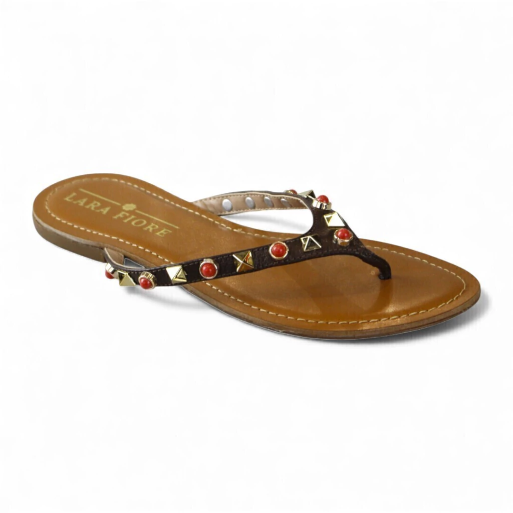 DESCRIÇAO: Uma sandália feminina tipo chinelo (rasteira) com palmilha marrom em couro sintético e costura aparente. Tirinha em T fina na cor marrom escuro decorada com tachas douradas em forma de pirâmide e pequenos detalhes vermelhos circulares. Solado plano e acabamento simples; visual casual e feminino.