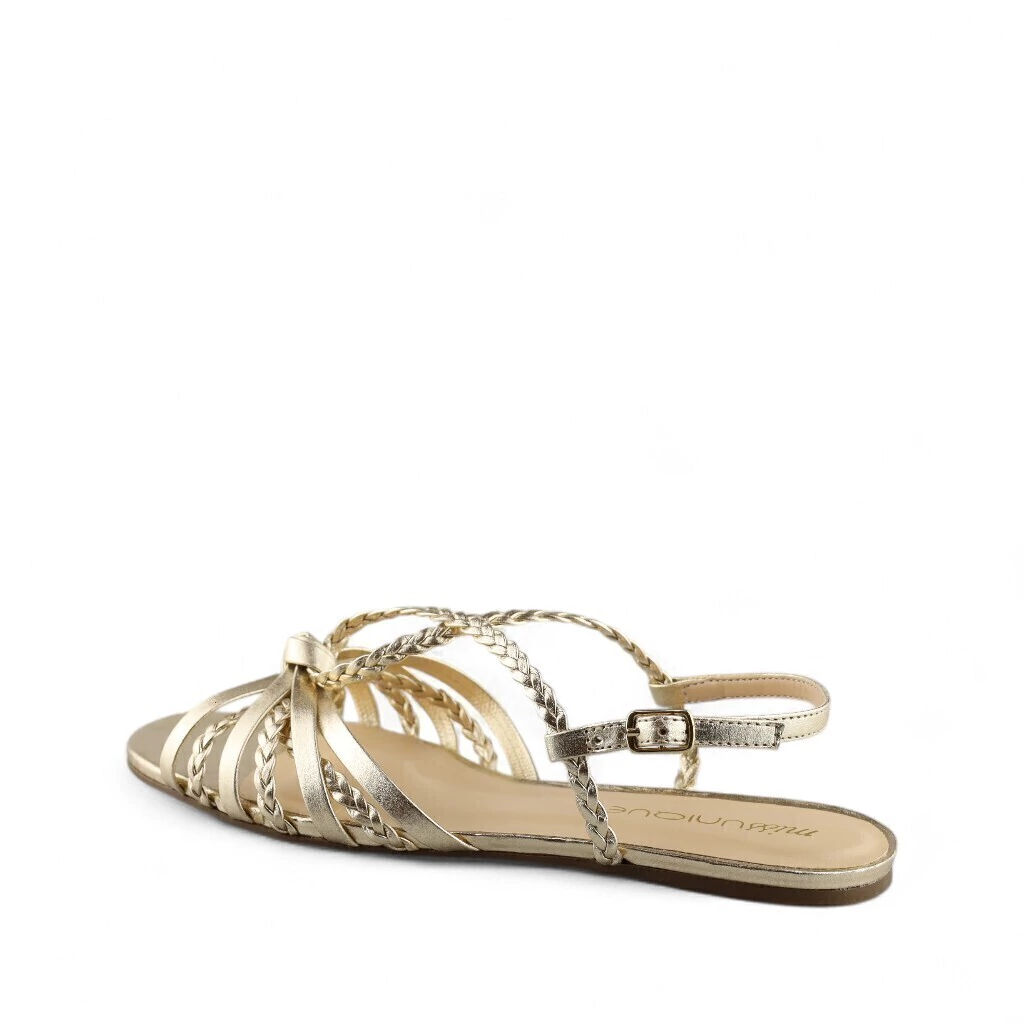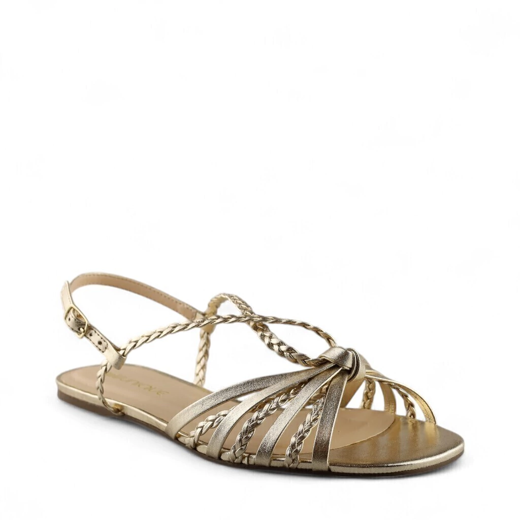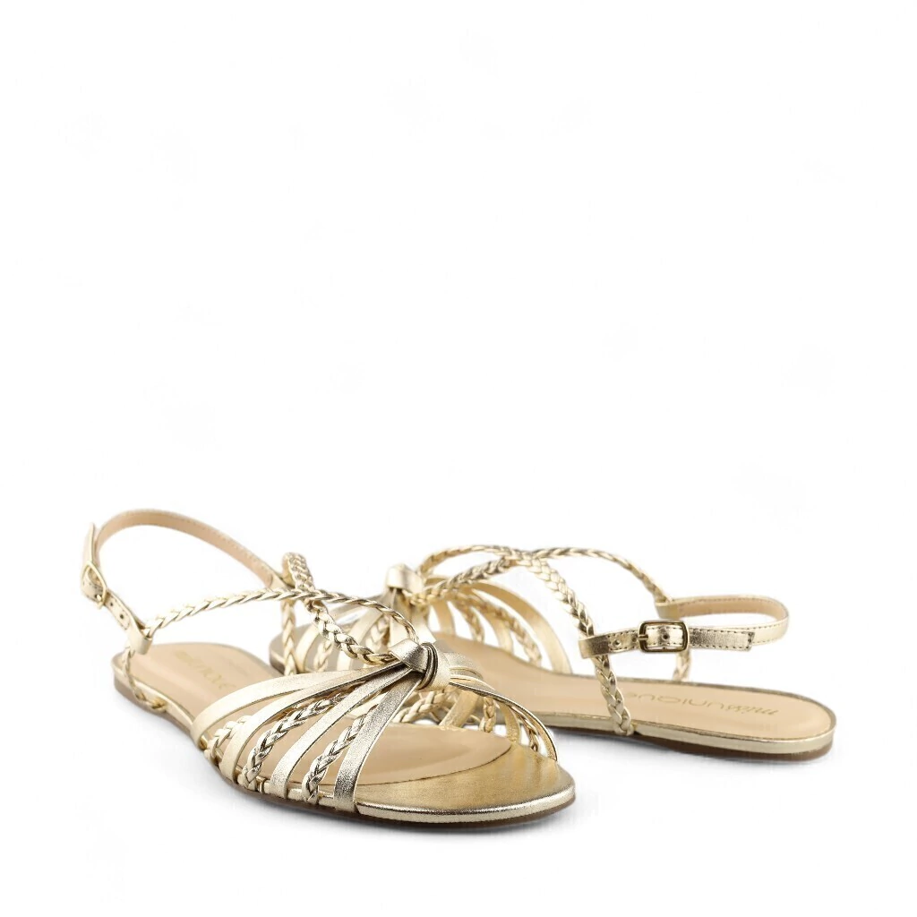 DESCRIÇÃO: A imagem mostra uma sandália feminina em um tom metálico dourado. O design é leve e elegante, com tiras trançadas que formam um padrão bonito na parte frontal. As tiras se cruzam e se unem em um nó central, adicionando um toque de sofisticação ao modelo. A sandália possui uma sola plana e um fecho com fivela na parte traseira, garantindo um ajuste seguro. Este modelo é ideal para ocasiões casuais e eventos de verão, proporcionando conforto e estilo, perfeito para complementar looks frescos e descontraídos.