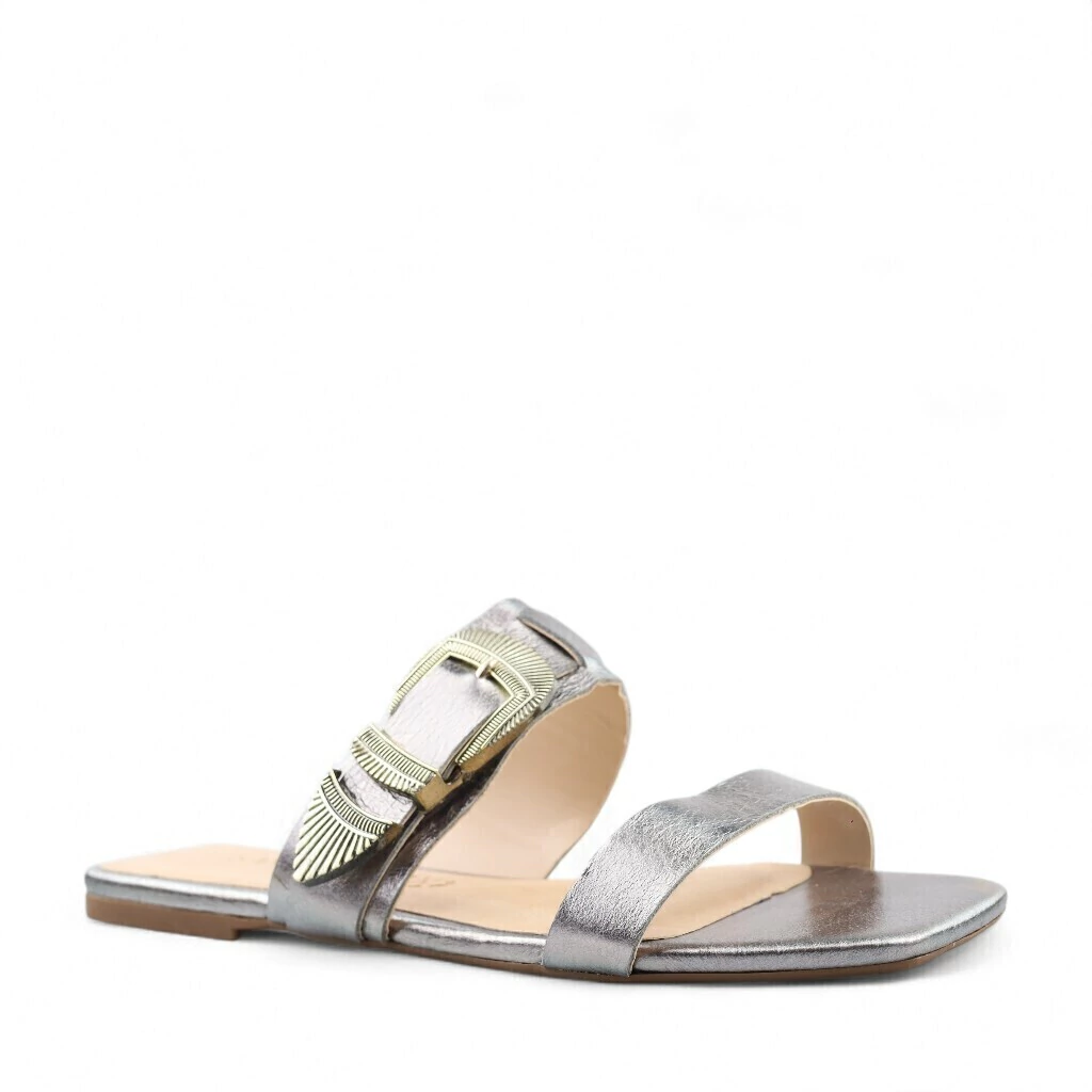 DESCRIÇÃO: A imagem apresenta uma sandália aberta em um tom metálico prateado. O design é elegante, com duas tiras finas na parte frontal e uma fivela decorativa robusta, que adiciona um toque de sofisticação. A sola é plana, sugerindo conforto e facilidade de uso. Este modelo é ideal para looks casuais ou semi-formais, proporcionando um visual moderno e estiloso.
