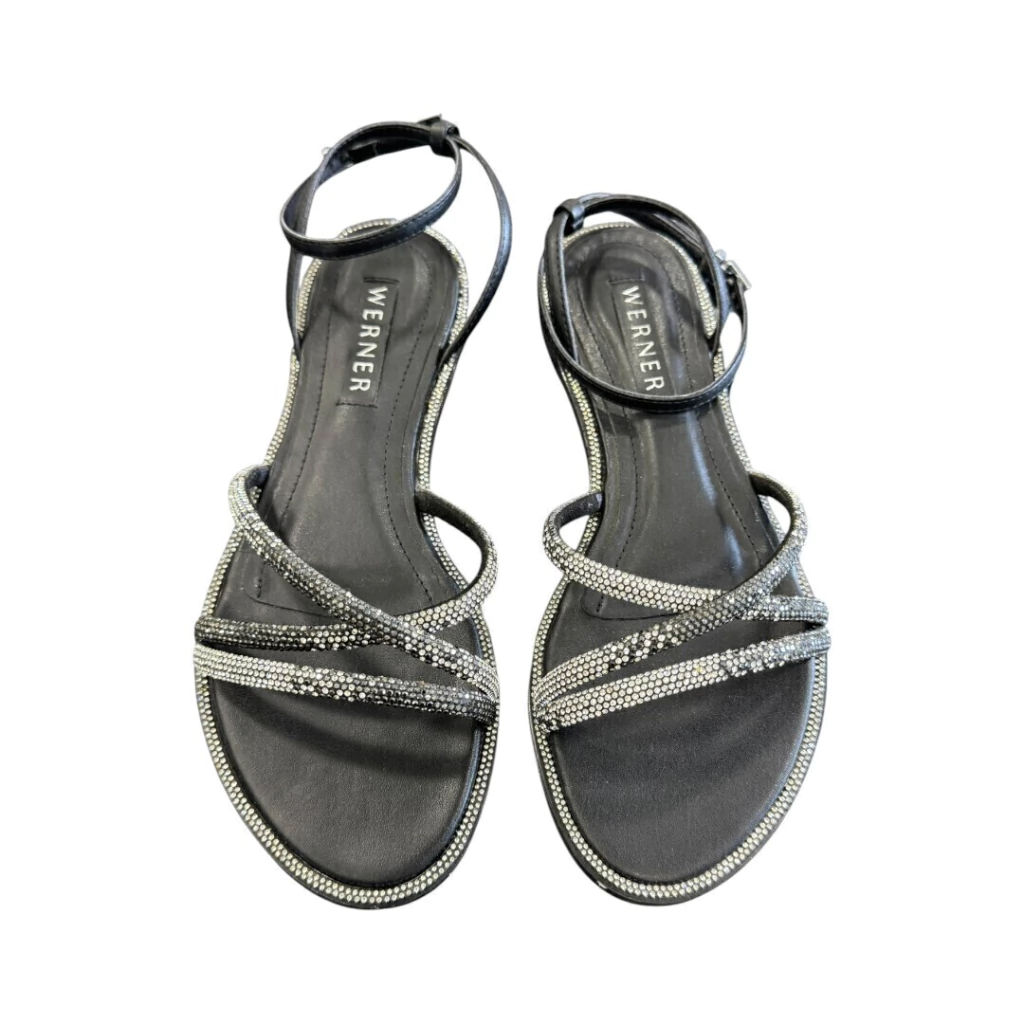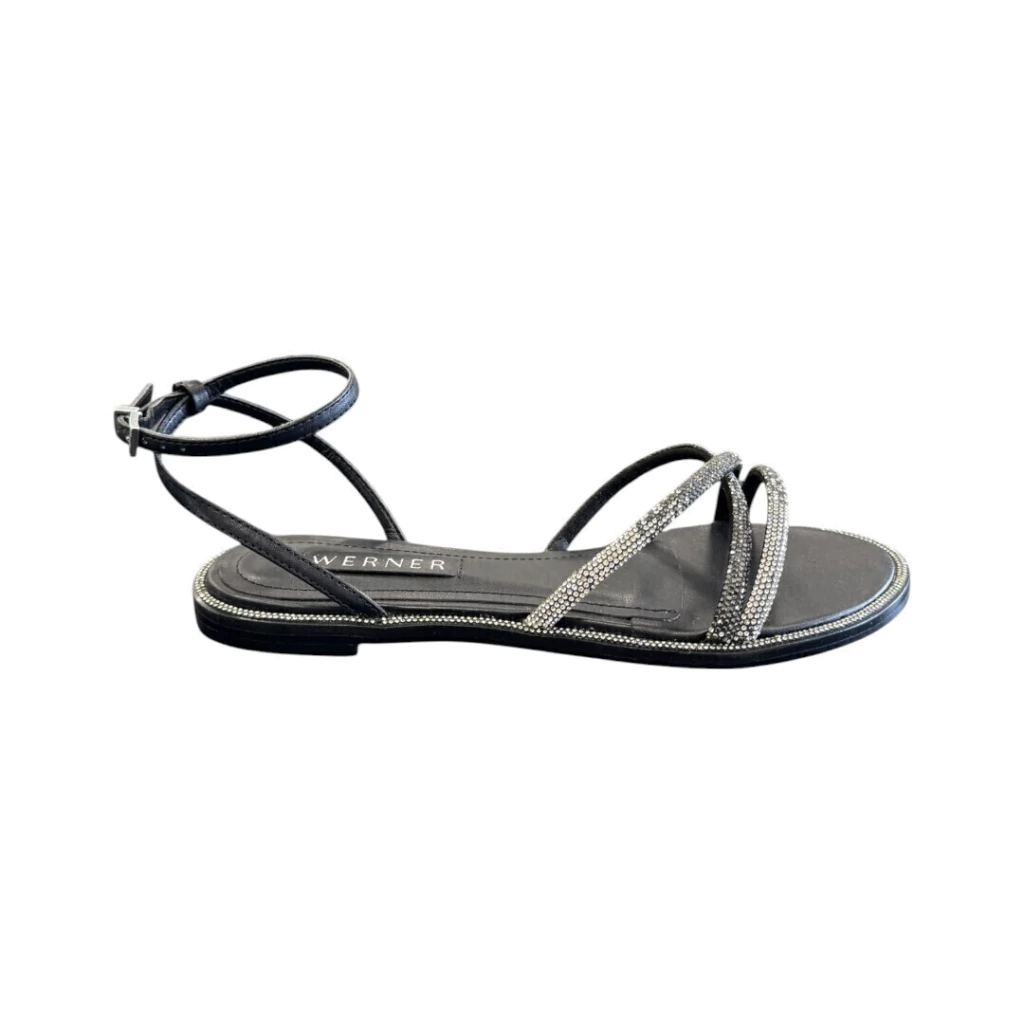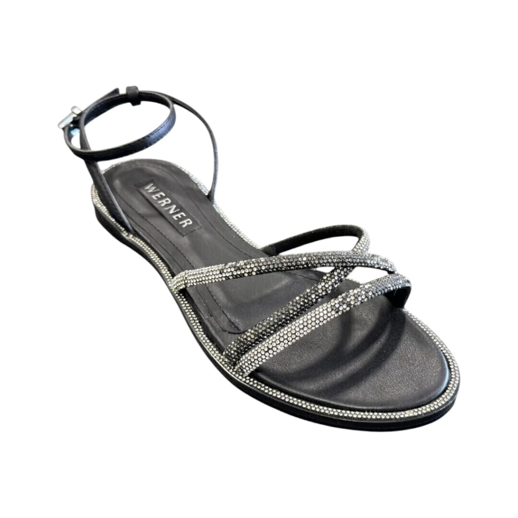 DESCRIÇÃO: A imagem apresenta um par elegante de sandálias rasteiras com um design sofisticado. As tiras são finas e entrelaçadas, proporcionando um visual delicado. Uma das tiras é adornada com detalhes brilhantes, que trazem um toque de glamour ao modelo. A sandália possui uma alça no tornozelo com fivela para ajuste, garantindo conforto e segurança. O solado é liso e em um tom escuro, equilibrando a leveza das tiras. Essas sandálias são ideais para eventos casuais ou semi-formais, combinando estilo e conforto de forma atraente.