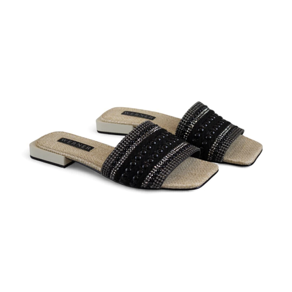 DESCRIÇÃO: Essa rasteira é elegante e moderna, com base em tom natural que cria um contraste sofisticado com a tira larga em preto. O design apresenta aplicação de pedrarias e microesferas que adicionam brilho e textura ao visual, trazendo um toque de glamour ao modelo. O salto baixo geométrico garante conforto e estilo, ideal para compor produções casuais com um ar refinado.