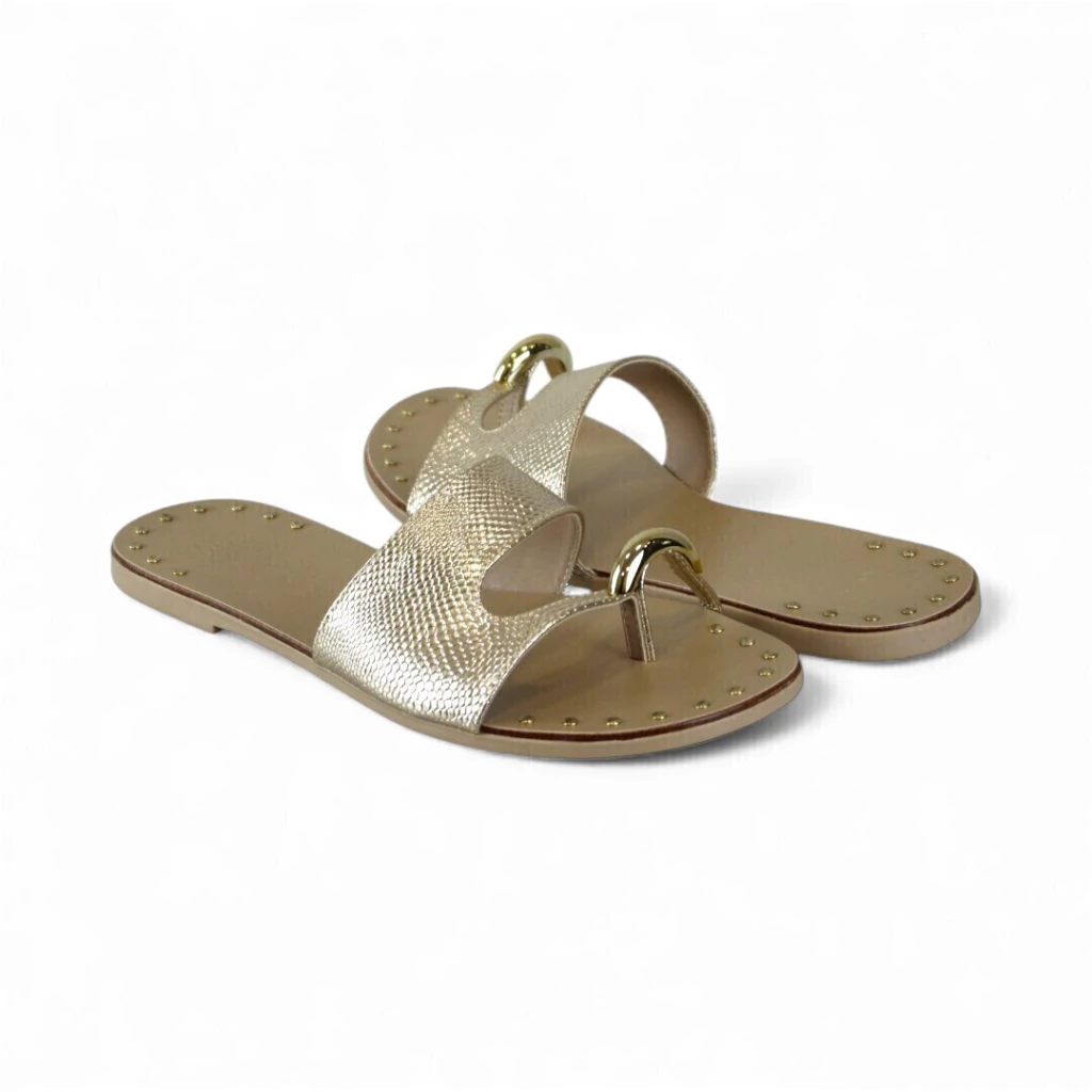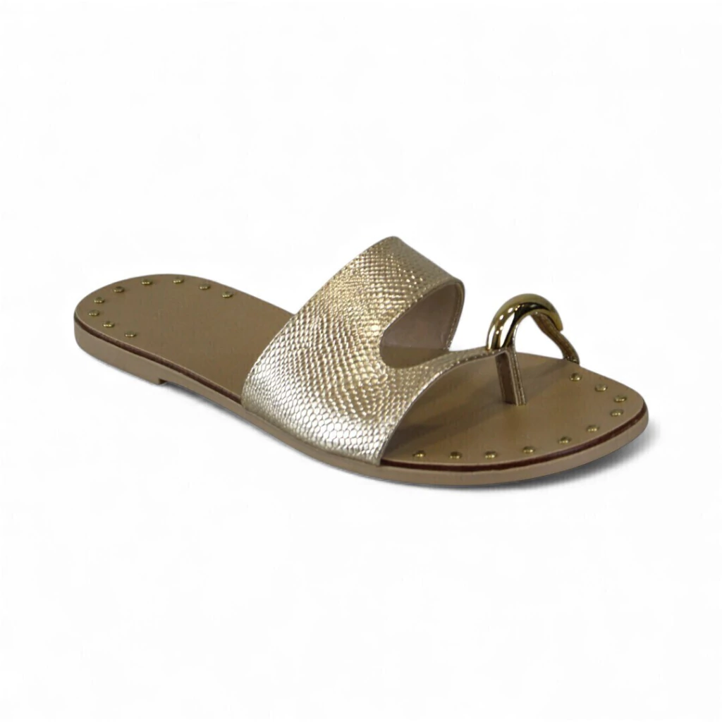 DESCRIÇÃO: Rasteira feminina em tom dourado metalizado com acabamento texturizado na tira ampla sobre o peito do pé. Modelo com tira tipo “dedo” (toe loop) finalizada por argola metálica dourada como detalhe frontal. Palmilha lisa cor caramelo claro com filete costurado e aplicação de tachas douradas na região do calcanhar; sola plana e borda levemente definida. Visual elegante e festivo.