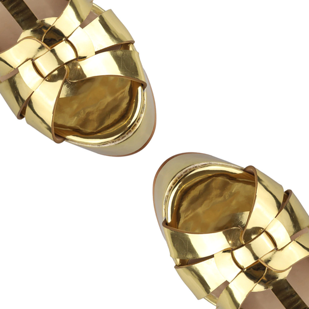 Esta sandália de salto alto apresenta um acabamento dourado metálico e tiras entrelaçadas, conferindo um visual glamouroso. Com um salto robusto e plataforma frontal para conforto, a tira ajustável no tornozelo garante segurança. Ideal para eventos especiais, ela traz elegância e ousadia a qualquer look.