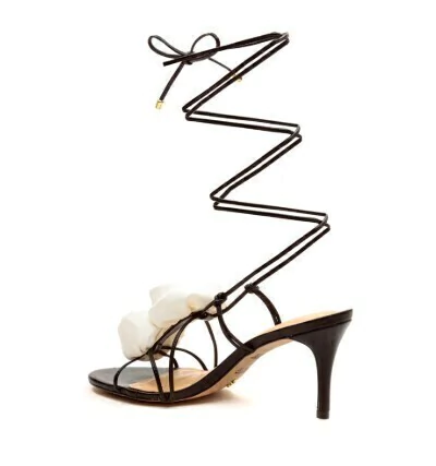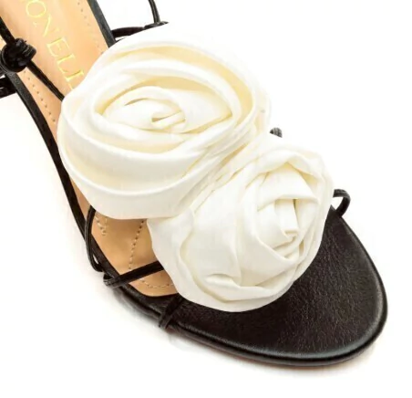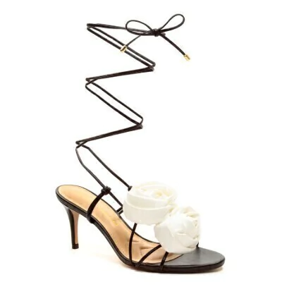 O modelo apresenta um cabedal em preto, que oferece um contraste elegante com os detalhes em forma de flores brancas na parte frontal. As tiras longas se entrelaçam ao longo da perna, criando um efeito visual dinâmico e ajustável.