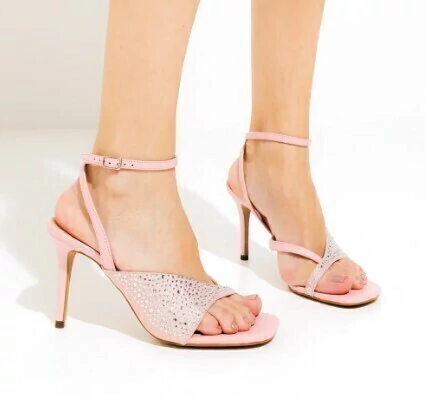 O modelo apresenta um tom suave de rosa, que adiciona um toque delicado e feminino. A parte frontal é adornada com detalhes brilhantes, criando um efeito glamouroso. As tiras que cruzam no peito do pé oferecem um design moderno, enquanto a tira ajustável no tornozelo proporciona conforto e segurança.