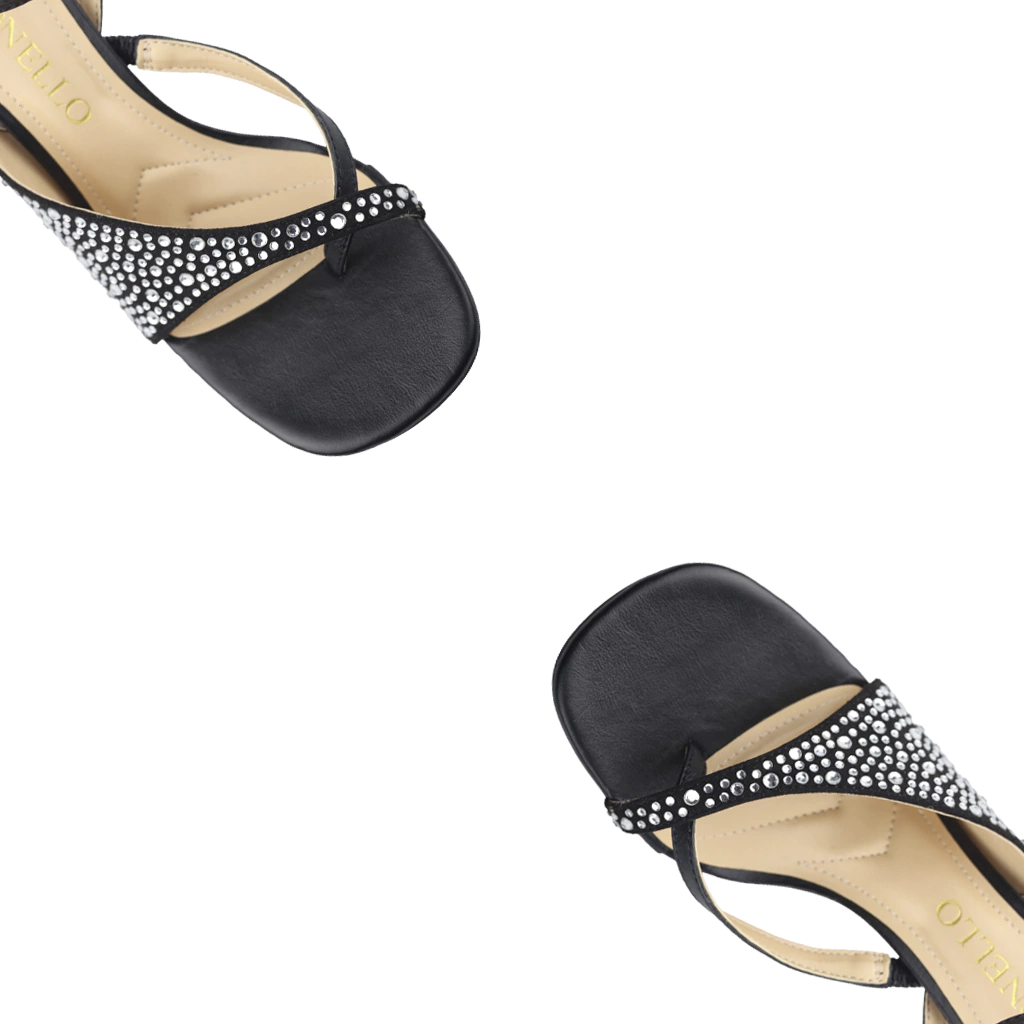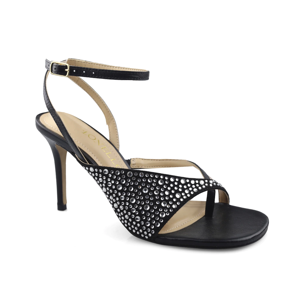 sandália de salto alto com um design elegante e glamouroso. O modelo é em tom preto, que confere sofisticação, e possui um detalhe deslumbrante de strass na parte frontal, adicionando um toque de brilho e charme.