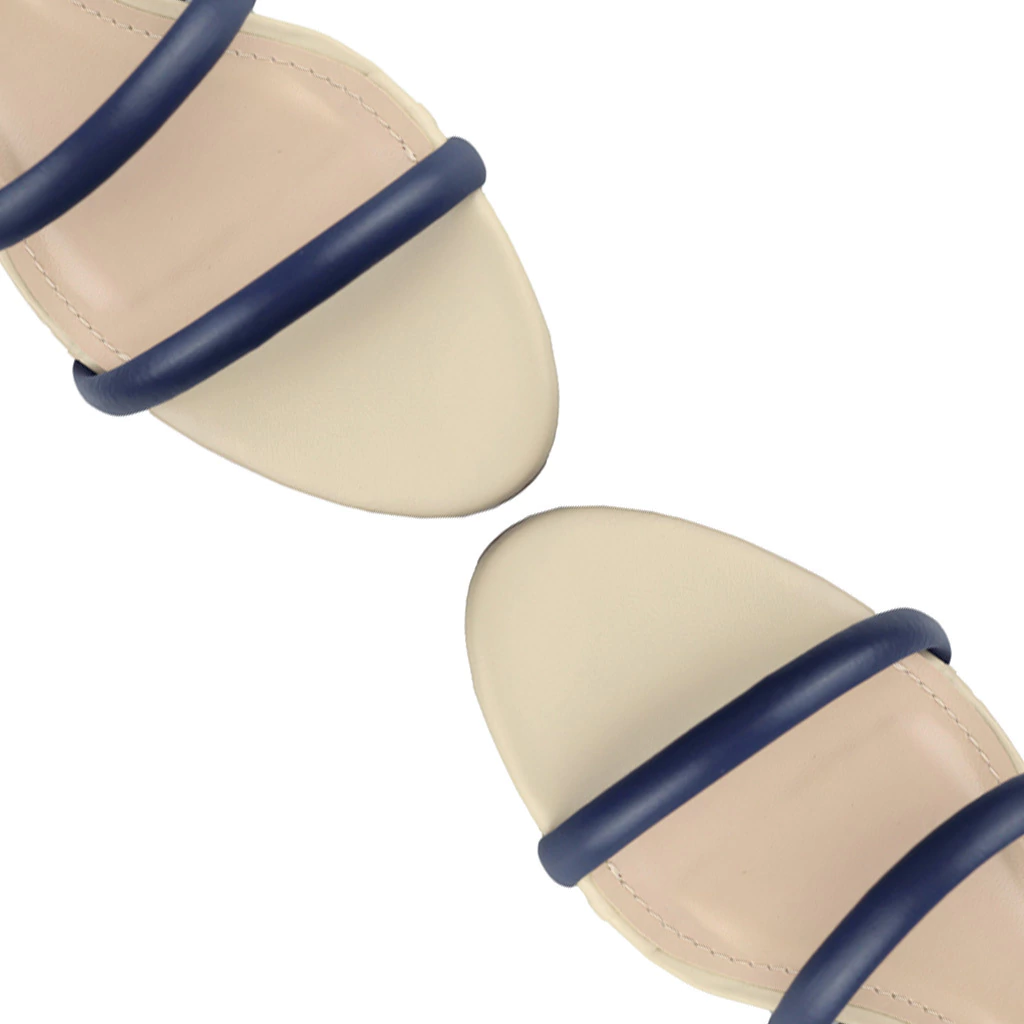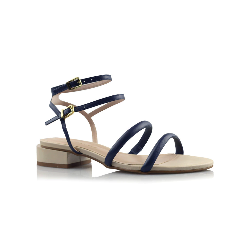 salto bloco com um design elegante e moderno. O modelo é confeccionado em couro na cor azul marinho, que traz um toque clássico e sofisticado. As tiras são finas e entrelaçadas, proporcionando um visual delicado e feminino.