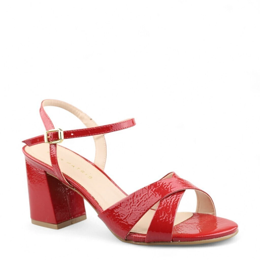 Descrição: A imagem mostra um par de sandálias de salto bloco em um vibrante tom de vermelho. O material tem um acabamento brilhante, dando um toque elegante ao modelo.