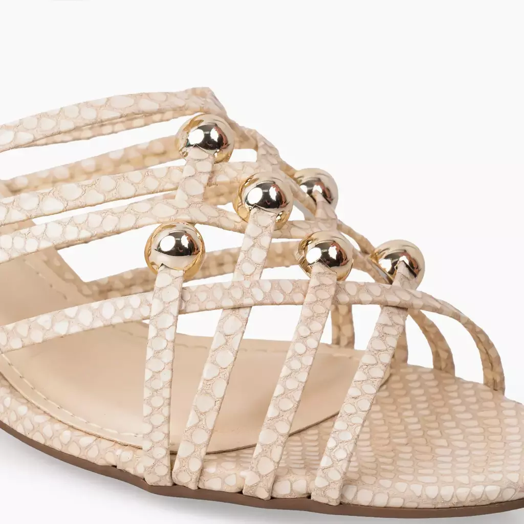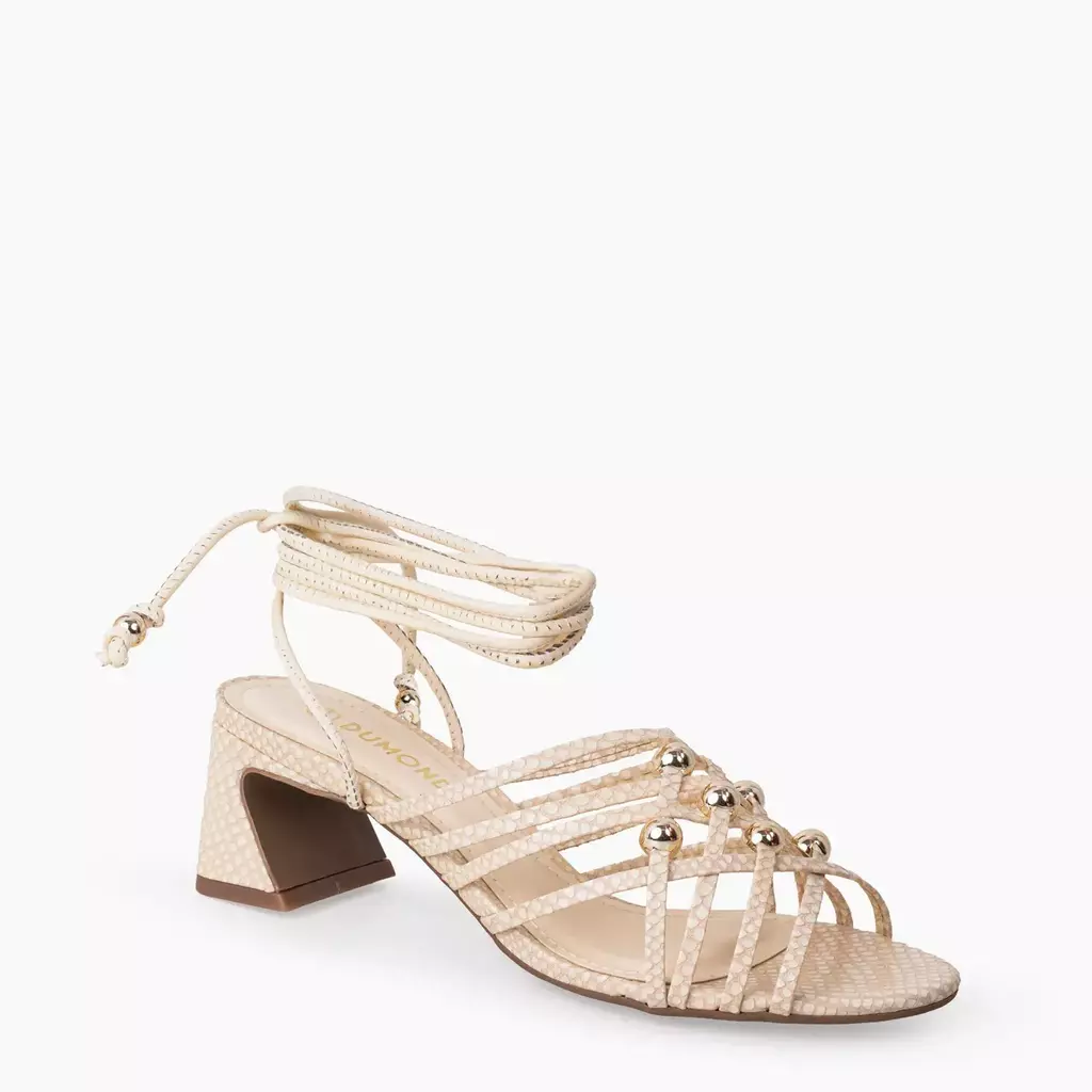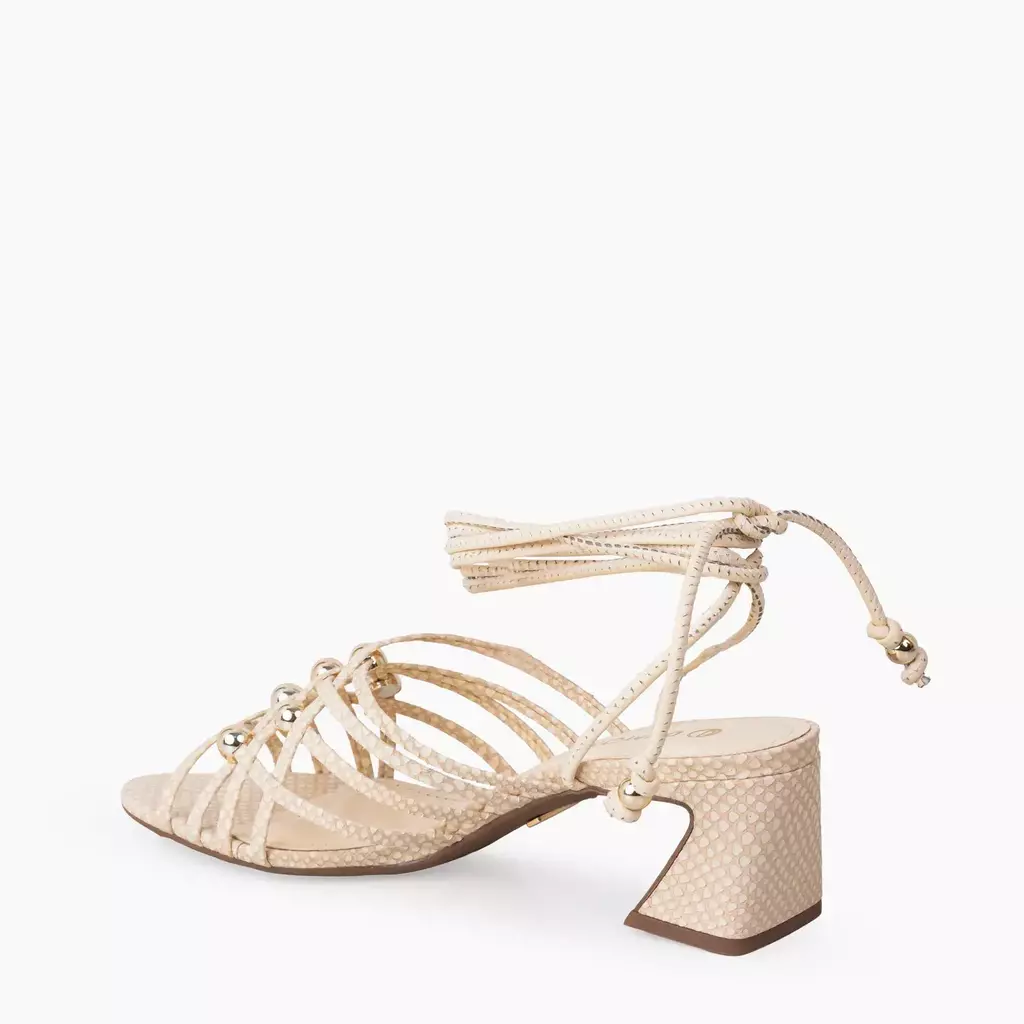 DESCRIÇÃO: Sandália Dumond em tom bege com textura que imita pele de cobra. Possui tiras finas entrelaçadas com aplicações de esferas metálicas e amarração no tornozelo. O salto bloco médio garante conforto e estabilidade. Moderna e elegante, é ideal para looks sofisticados e estilosos.