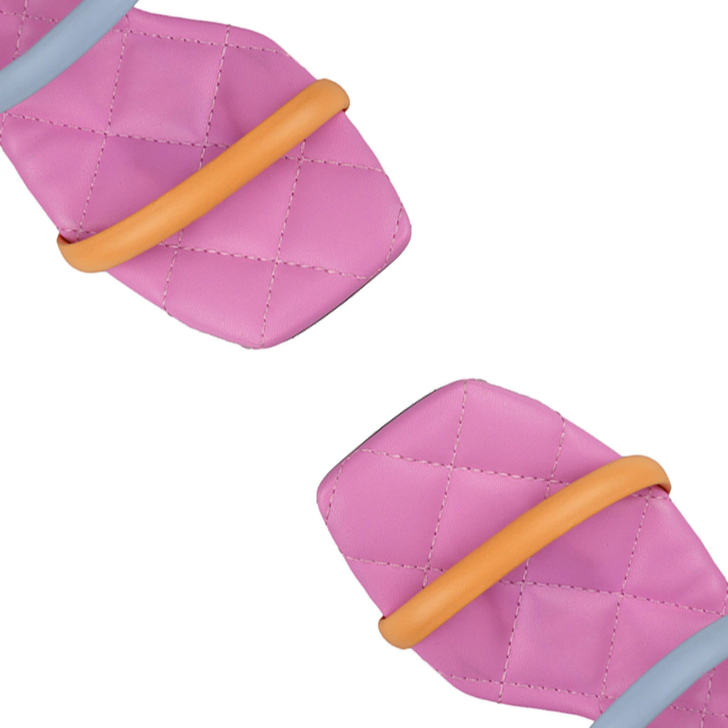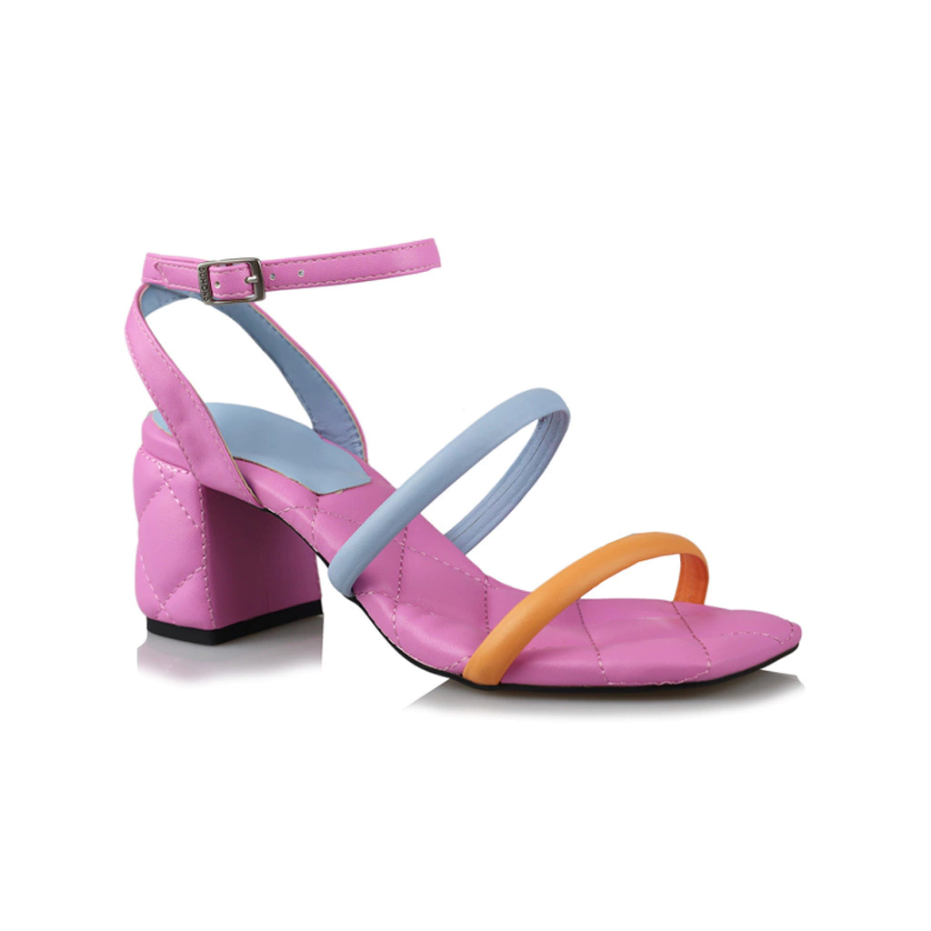 A imagem apresenta uma sandália feminina de salto bloco com um design moderno e colorido. As tiras são em tonalidades vibrantes de rosa, azul e laranja, criando um visual alegre.