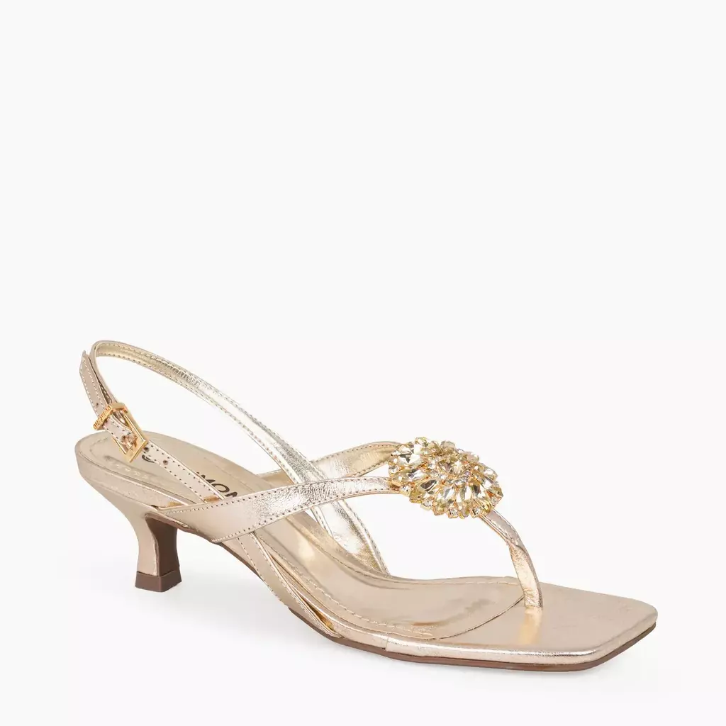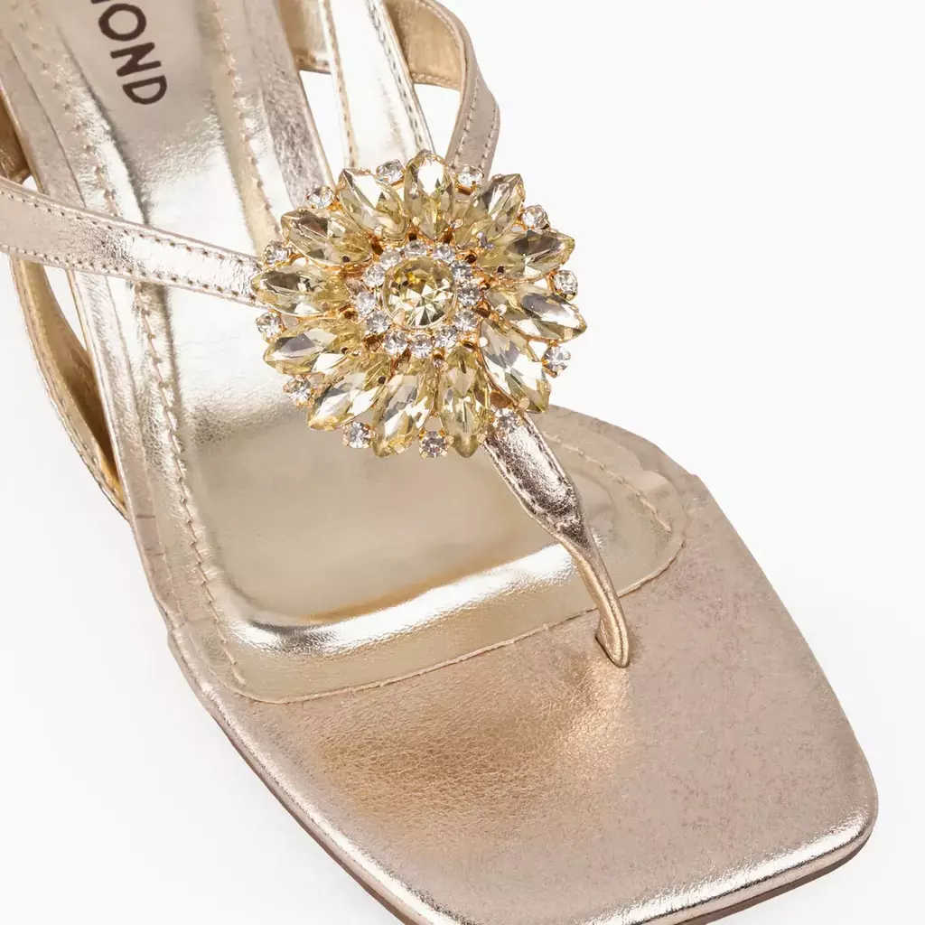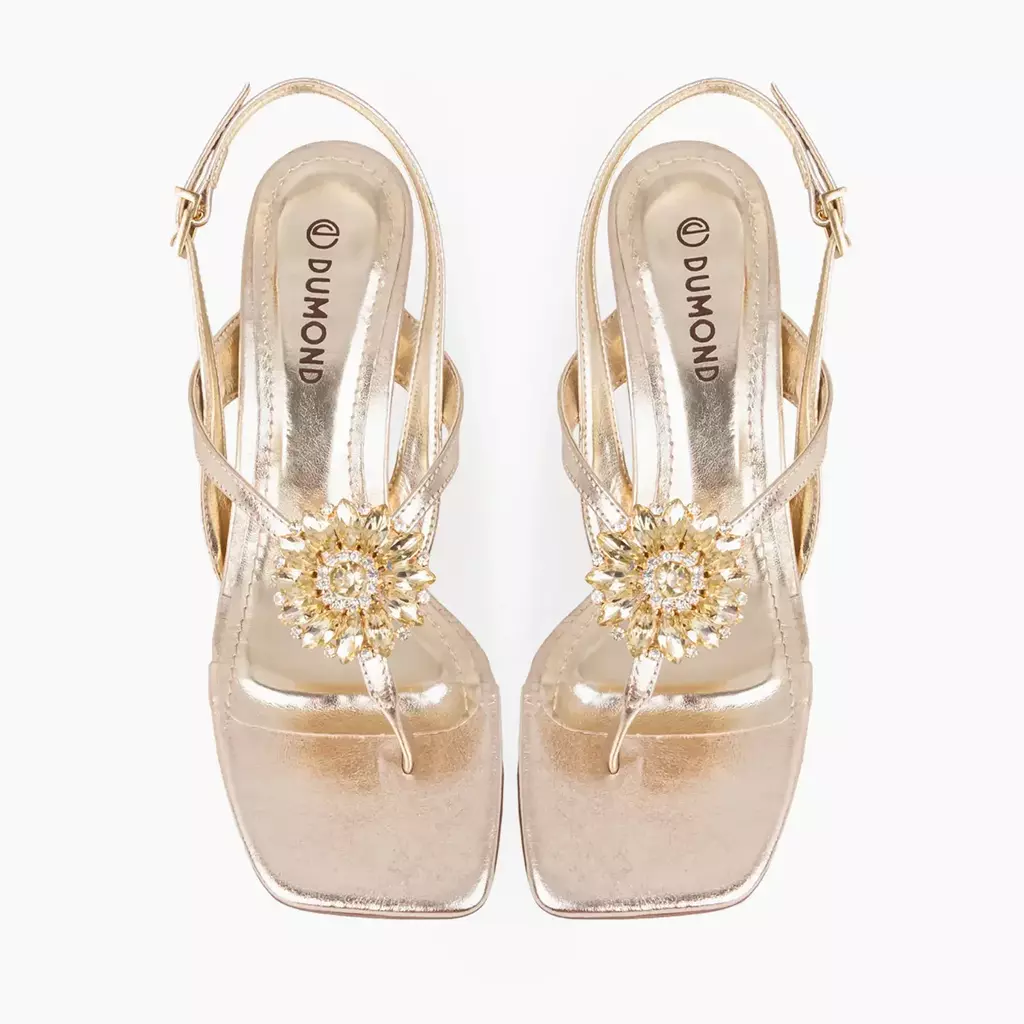 DESCRIÇÃO: Sandália Dumond dourada metalizada com bico quadrado e tiras finas delicadas. Possui detalhe de pedrarias na parte frontal e tira ajustável no calcanhar com fivela dourada. O salto taça baixo adiciona elegância e conforto, ideal para eventos e produções sofisticadas.