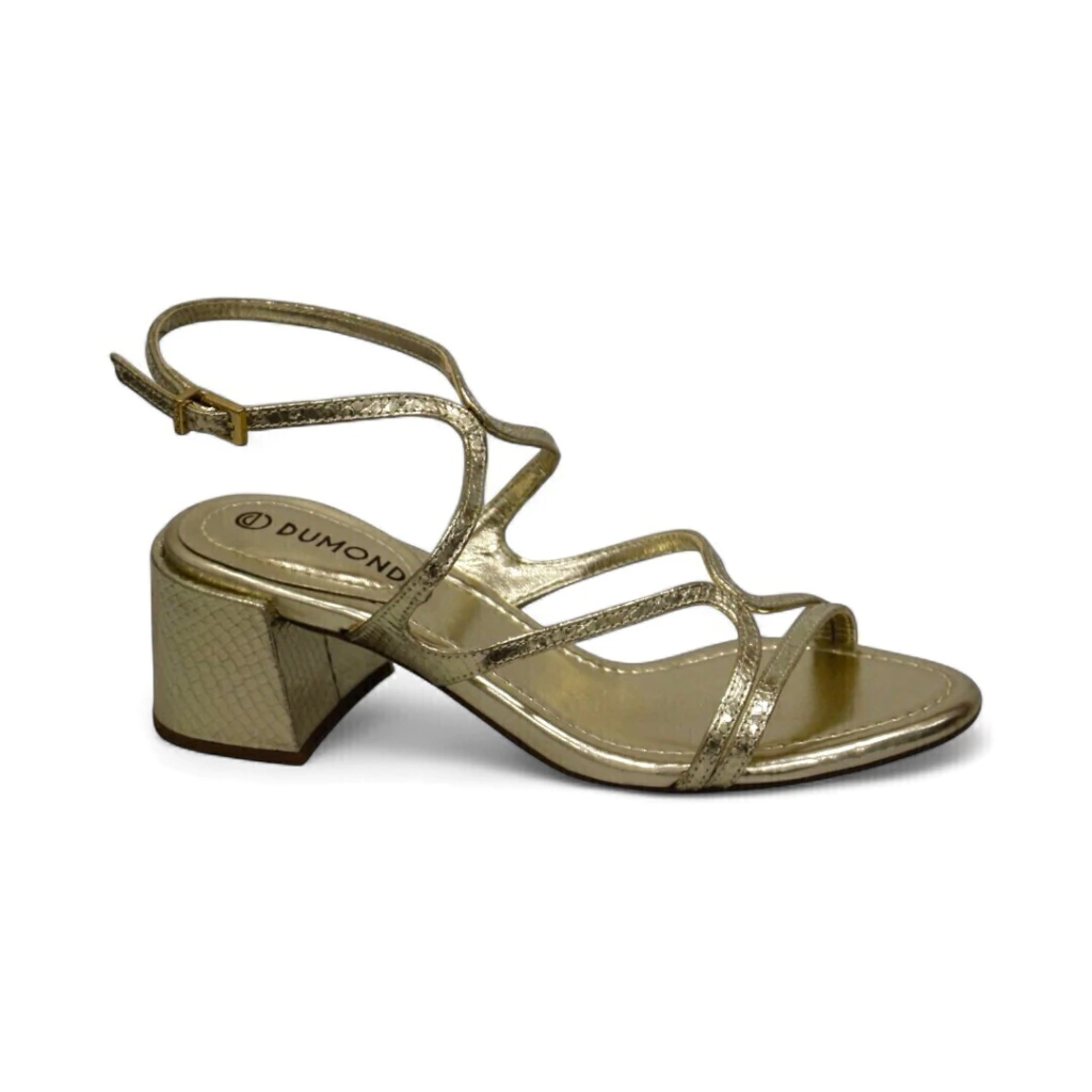 DESCRIÇÃO: Sandália Dumond dourada metalizada com tiras finas e design delicado. Possui salto bloco médio com textura e fechamento por fivela dourada no tornozelo. Sofisticada e confortável, é perfeita para compor looks elegantes e modernos.