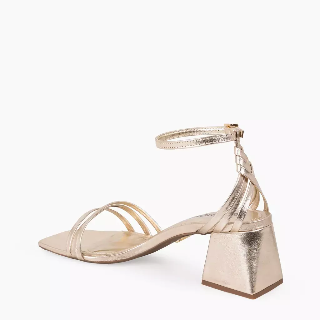 DESCRIÇÃO: Sandália Dumond dourada com tiras finas cruzadas na parte frontal e fechamento por fivela no tornozelo. Possui salto bloco médio e bico quadrado, unindo conforto e sofisticação. Ideal para compor produções elegantes e versáteis.