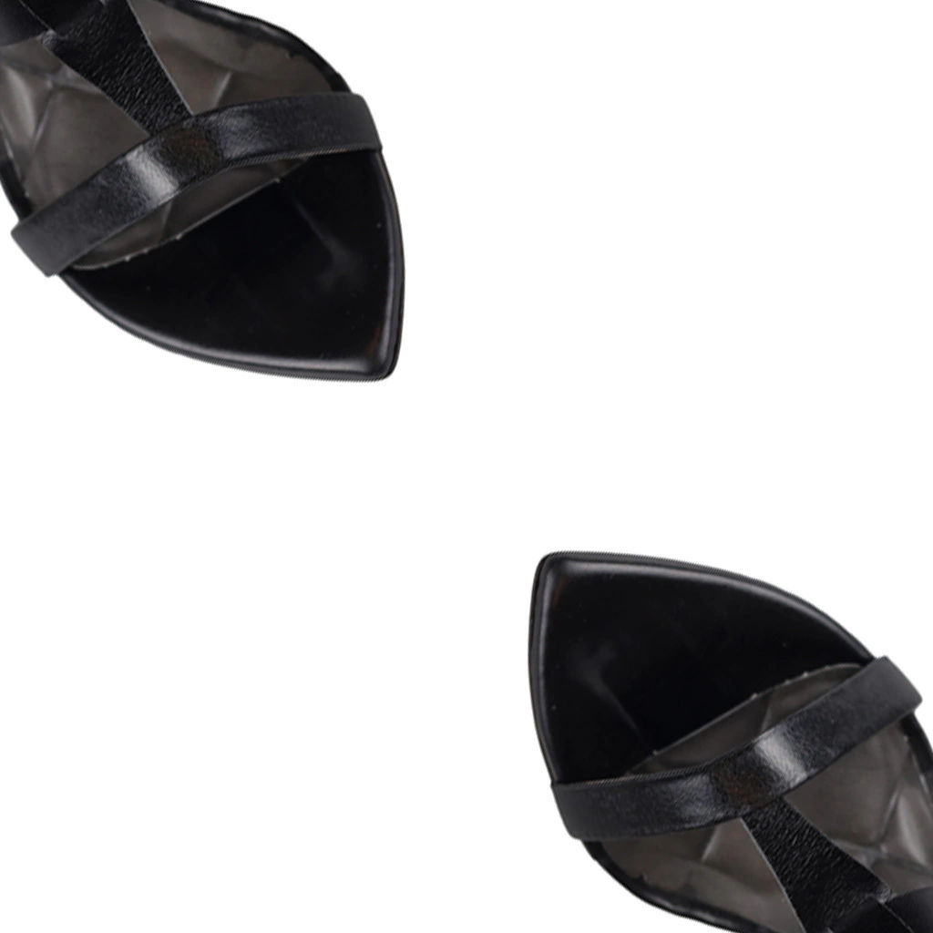 As sandálias são em couro preto, com tiras finas ajustáveis por fivelas douradas. O salto alto e fino confere sofisticação, enquanto a ponta quadrada traz um toque moderno. Ideal para ocasiões elegantes, combinam estilo e conforto.