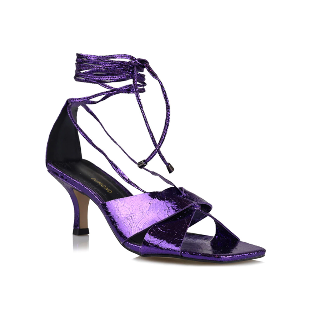 As sandálias possuem um acabamento metálico em um vibrante tom de roxo, destacando-se pelo seu brilho e textura brilhante. O design apresenta tiras cruzadas na frente, que criam um visual elegante e contemporâneo. Uma faixa de amarração envolve o tornozelo, permitindo um ajuste personalizado e adicionando um toque estiloso. O salto é baixo e fino, proporcionando conforto e estabilidade ao caminhar. Essas sandálias são ideais para eventos noturnos e ocasiões especiais, trazendo um toque de glamour e sofisticação ao look.