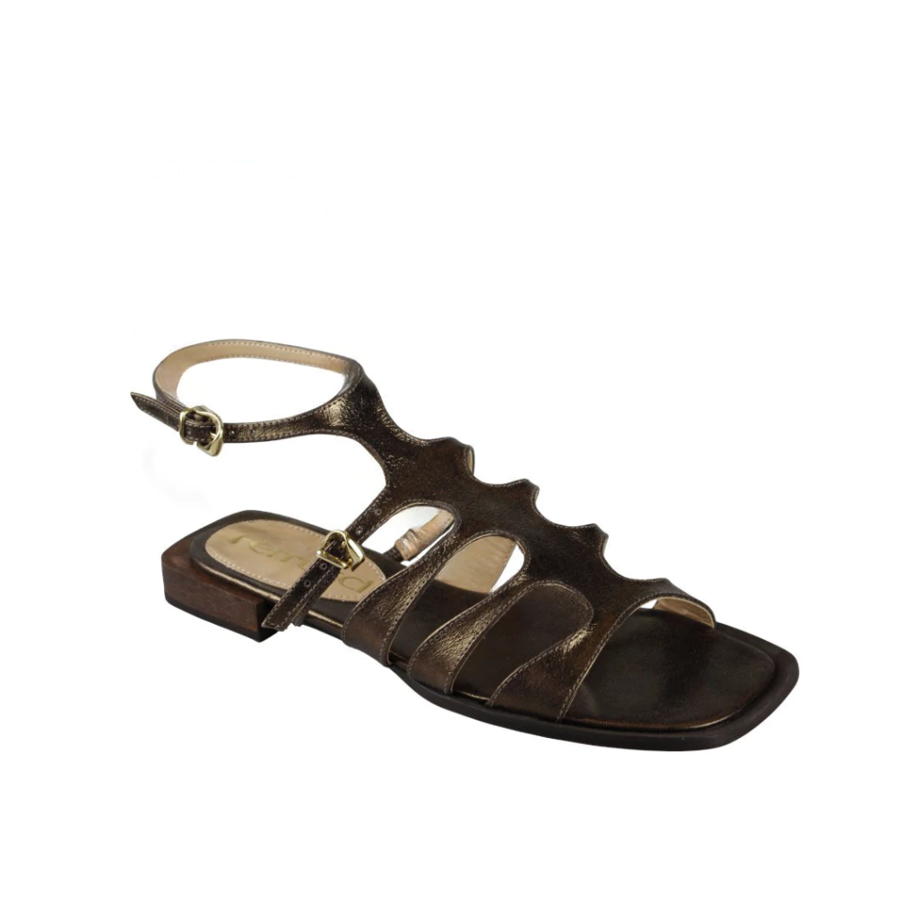 DESCRIÇÃO:Sandália feminina metálica em tom bronze/antigo com acabamento ligeiramente brilhante. Possui bico quadrado e sola fina com pequeno salto baixo em acabamento que lembra madeira. Cabedal com recortes em formato ondulado/escotado ao longo do peito do pé, formando aberturas laterais; duas tiras laterais na parte frontal e tira de tornozelo com fivela dourada para ajuste. Visual sofisticado e moderno, indicada para looks casuais e mais arrumados.
