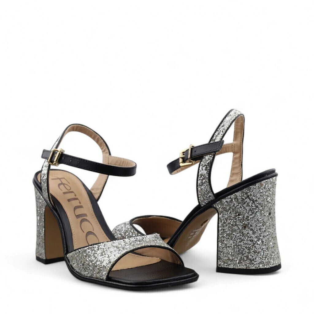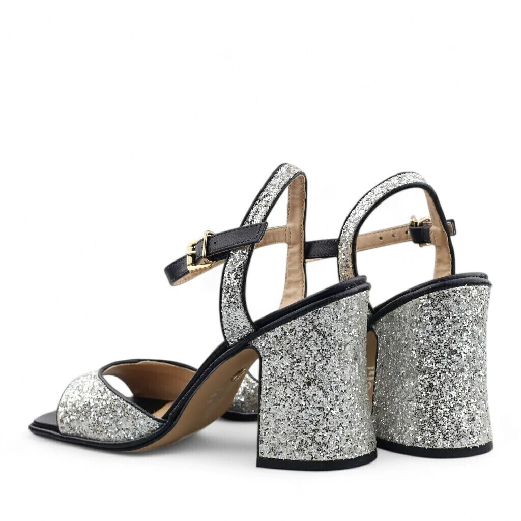 DESCRIÇÃO:A imagem apresenta uma sandália de salto alto com um design chamativo. O modelo combina uma faixa frontal coberta de glitter prateado com uma base em couro preto, criando um contraste elegante. A tira que envolve o tornozelo tem um fecho em metal dourado, permitindo um ajuste seguro.