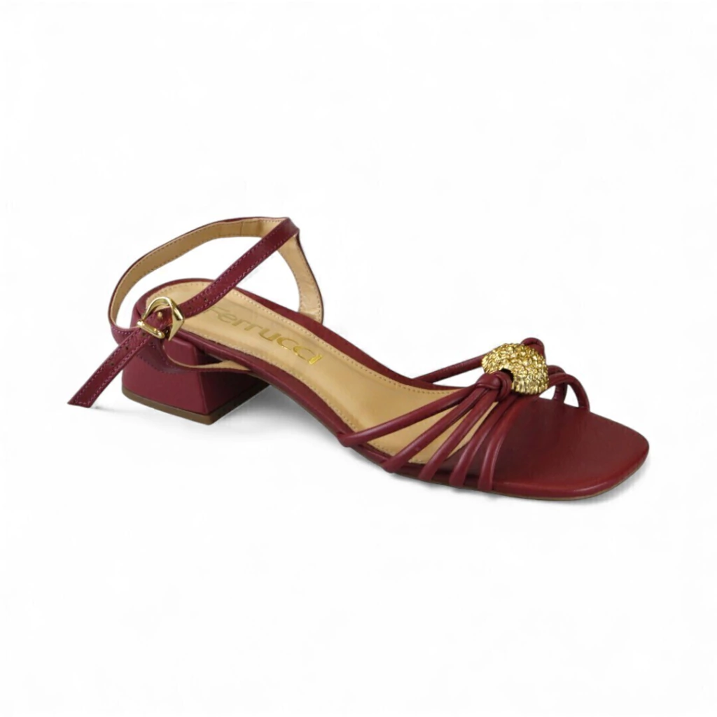 DESCRIÇÃO:Sandália feminina em couro vinho/bordô com acabamento liso. Bico levemente quadrado e várias tiras finas entrelaçadas sobre os dedos, unidas por um grande aplique dourado texturizado em formato de nó. Tira no tornozelo com fivela dourada ajustável, palmilha caramelo levemente acolchoada e salto bloco baixo revestido na mesma cor. Visual sofisticado e feminino.