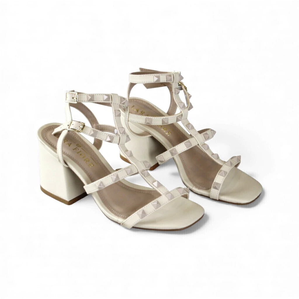 DESCRIÇAO: Sandália feminina de salto bloco médio em tom off-white/creme. Possui várias tiras finas formando um T sobre o peito do pé, decoradas com tachas piramidais do mesmo tom; tira no tornozelo com fivela dourada para ajuste e outra fivela lateral. Bico levemente quadrado, palmilha acolchoada em tom nude e solado com acabamento discreto. Visual elegante e contemporâneo, ideal para ocasiões formais ou eventos.
