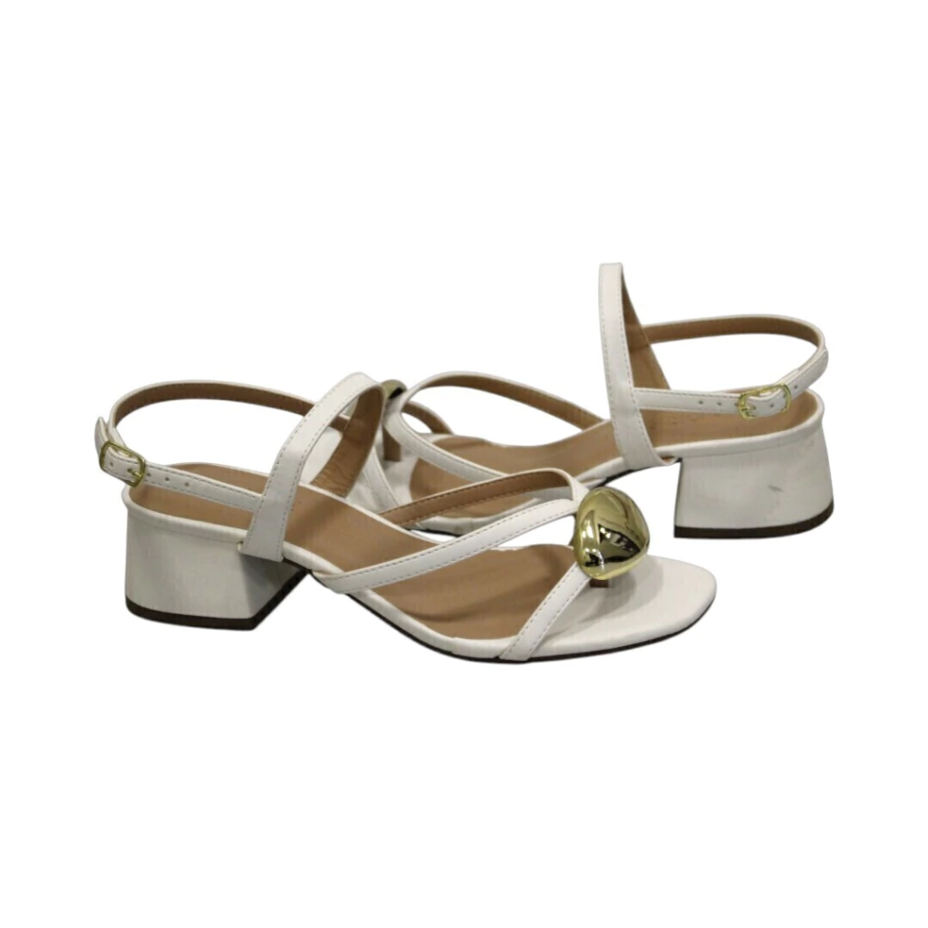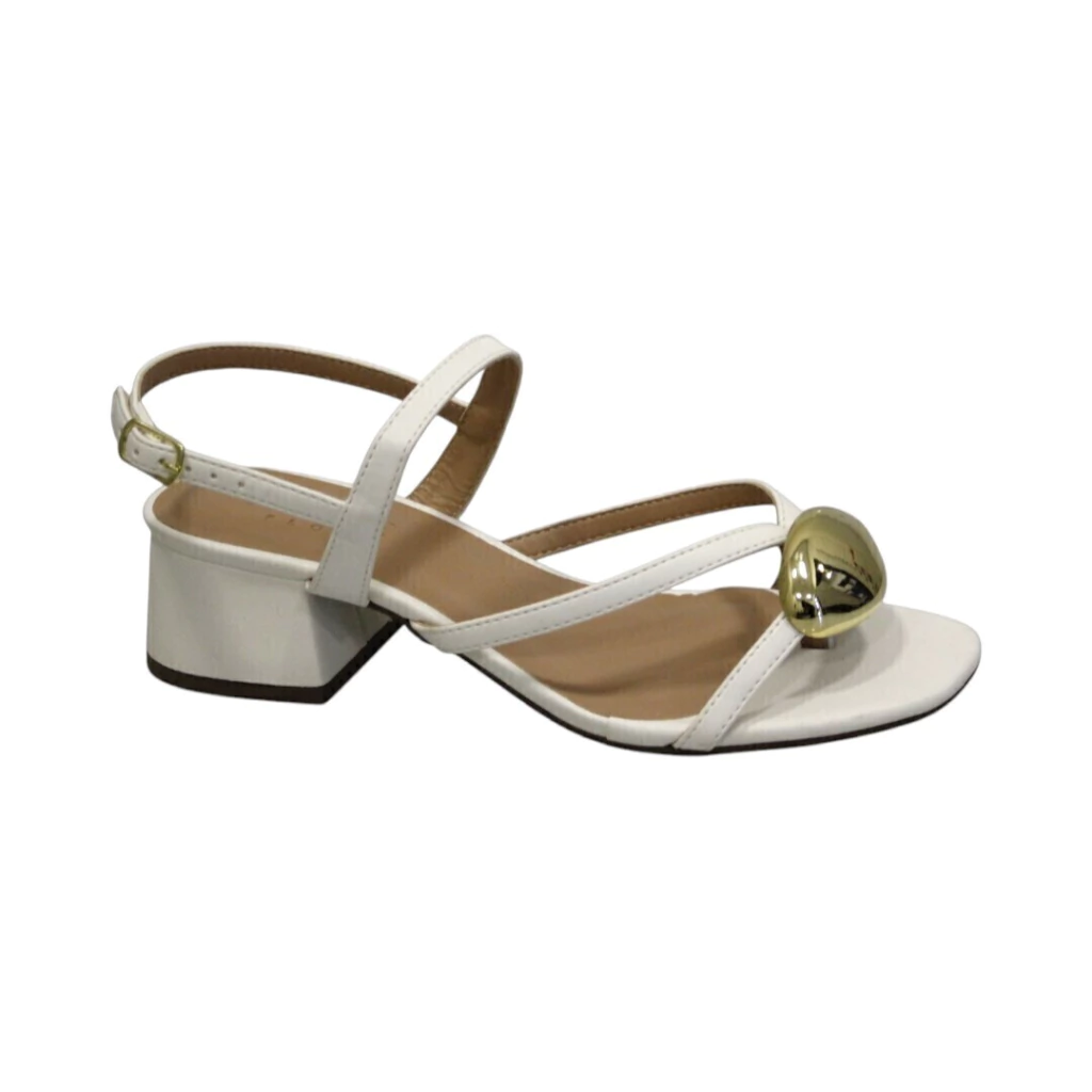 DESCRIÇÃO: Sandália branca com salto baixo e tiras finas que garantem leveza e elegância. Possui detalhe em esfera metálica dourada na parte frontal e fechamento com fivela lateral. Um modelo delicado e moderno, ideal para compor produções sofisticadas e confortáveis.