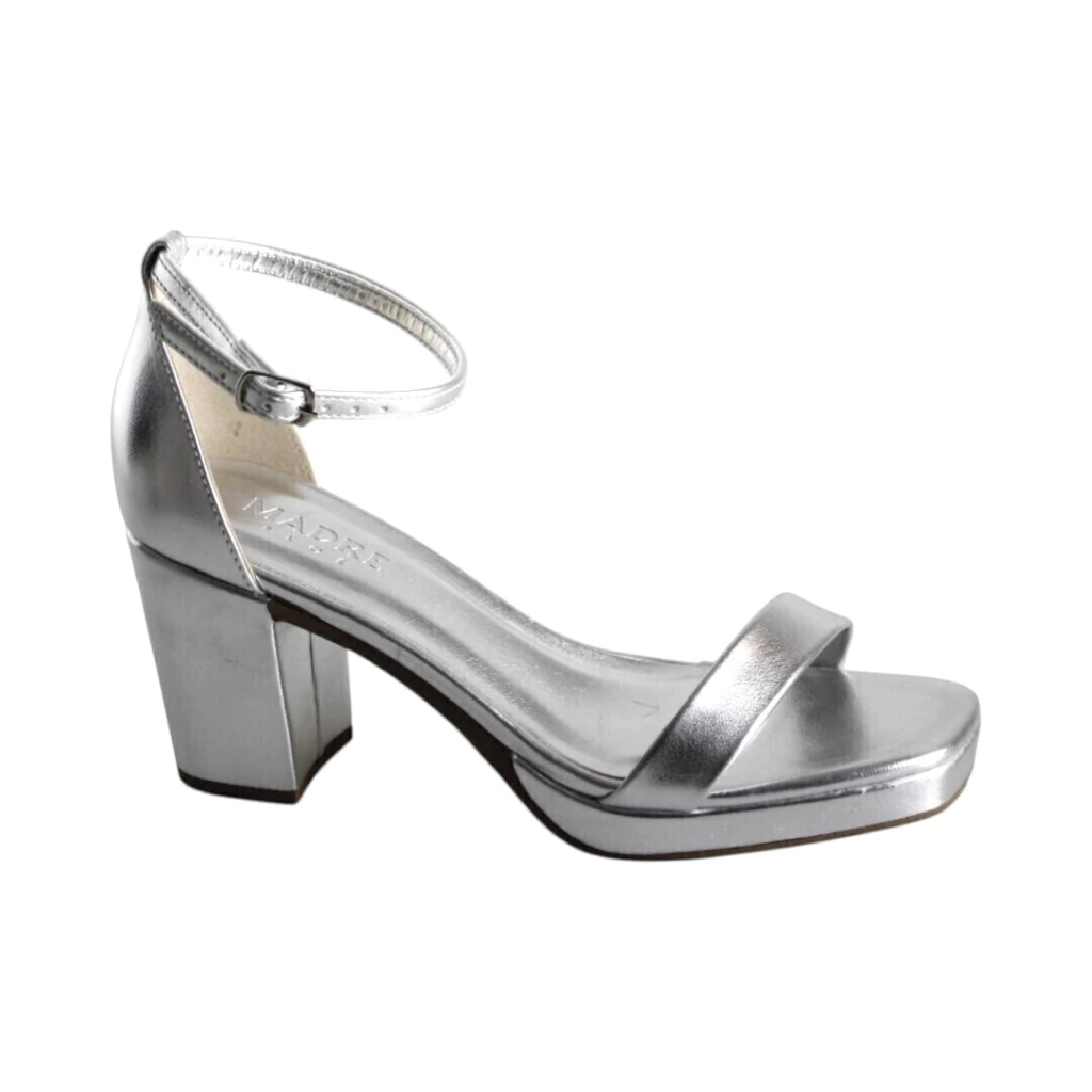 DESCRIÇÃO: Sandália prata com salto bloco alto e tira única na parte frontal. Possui fechamento com fivela no tornozelo e acabamento metalizado, que confere brilho e sofisticação. Um modelo elegante e confortável, ideal para eventos e produções refinadas.