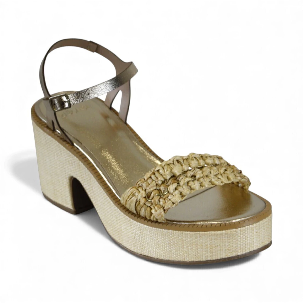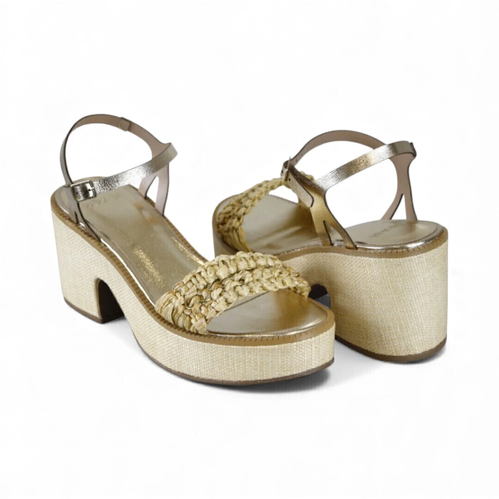 DESCRIÇÃO:Sandália feminina de plataforma com acabamento em tons naturais e metalizados. Pala frontal em tiras trançadas rústicas (rafia ou similar) na cor palha, biqueira quadrada aberta em verniz dourado claro. Tira de tornozelo fina e ajustável com fivela prateada/metalizada, apoio posterior recortado. Plataforma alta e salto bloco com revestimento texturizado cor de palha/bege, borda superior em marrom claro; palmilha metalizada dourada brilhante. Sola com leve contraste na borda inferior.