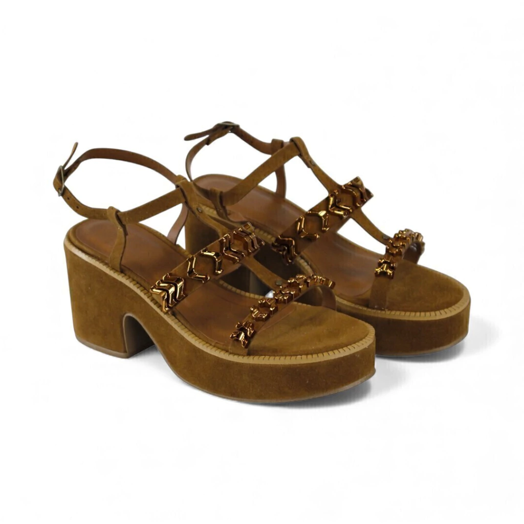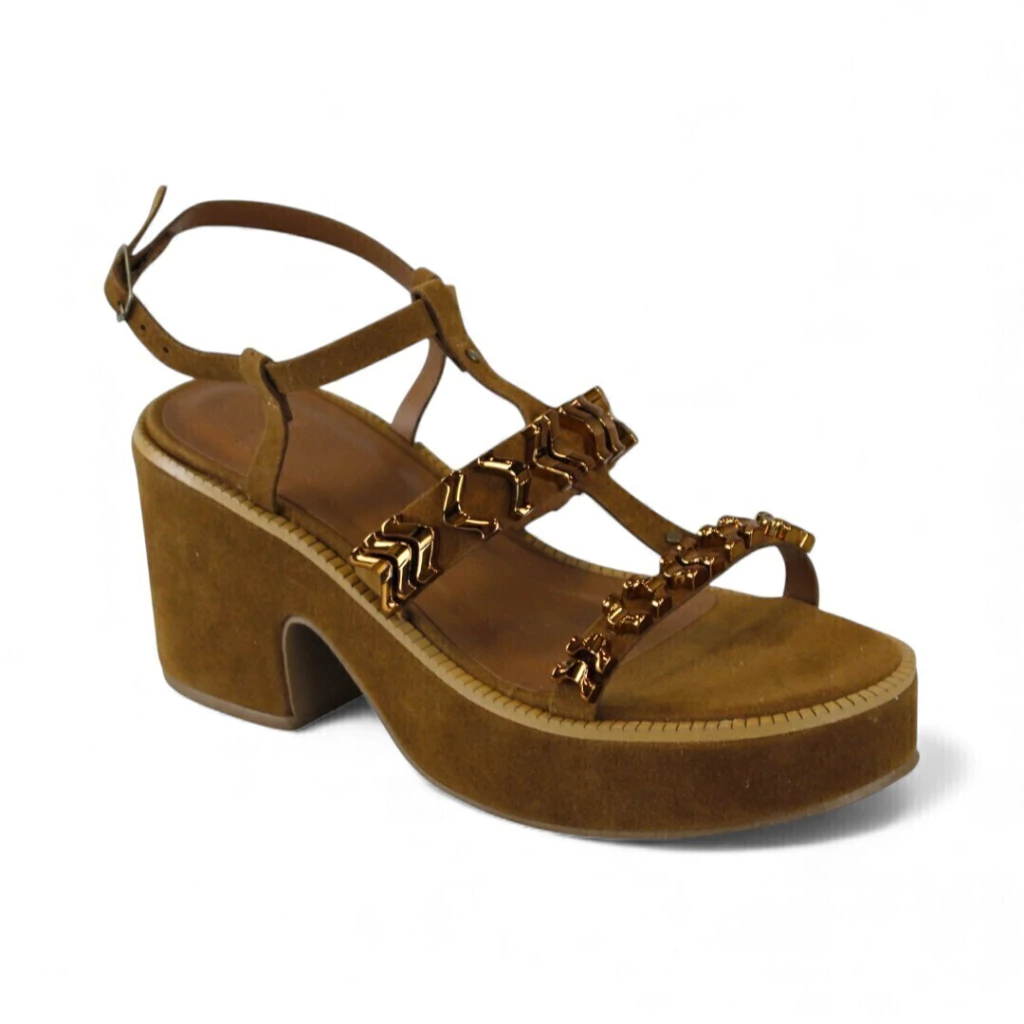 DESCRIÇÃO: Sandália feminina em camurça marrom/terra com plataforma alta e salto bloco escultural. Possui tiras em T e tira de tornozelo com fivela ajustável; duas tiras frontais sobre o pé decoradas com adornos metálicos dourados em formato de elos/peças geométricas. Palmilha em tom marrom liso, laterais da plataforma com costura decorativa.