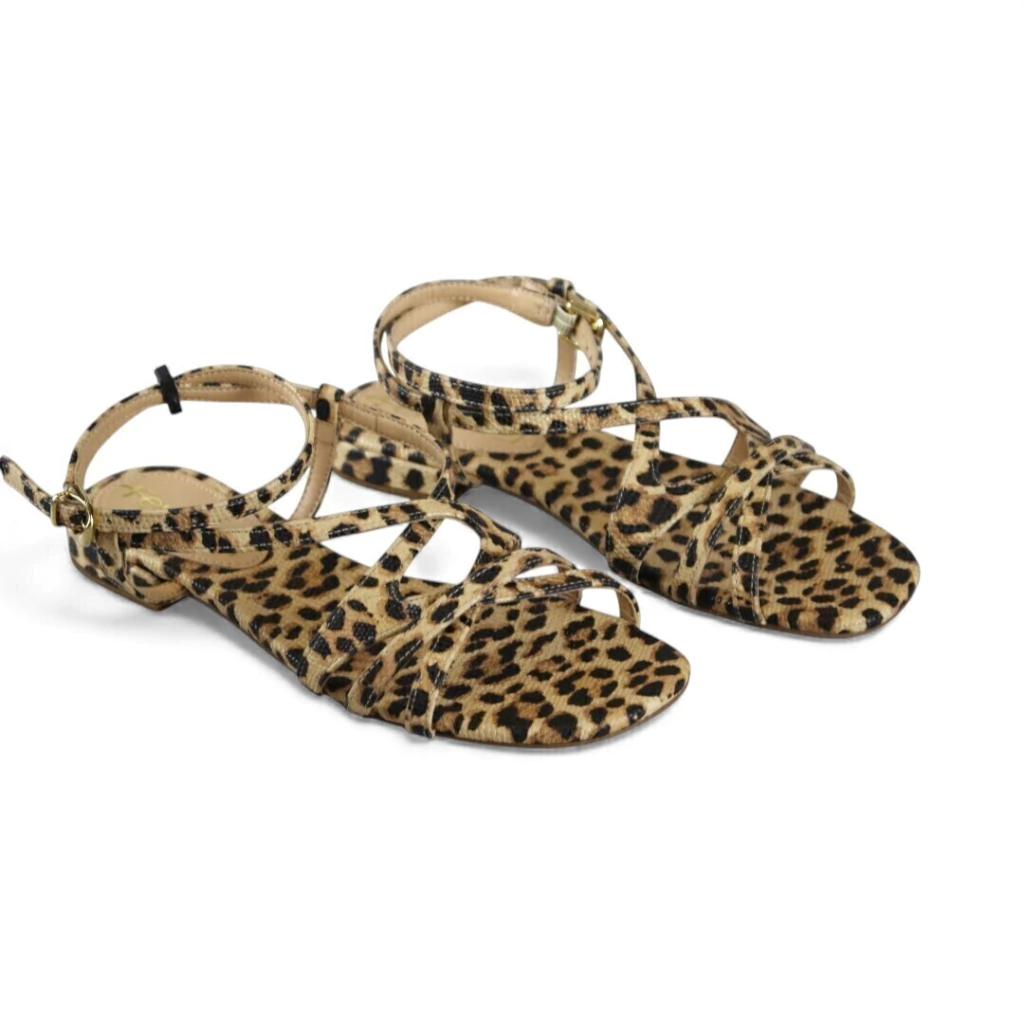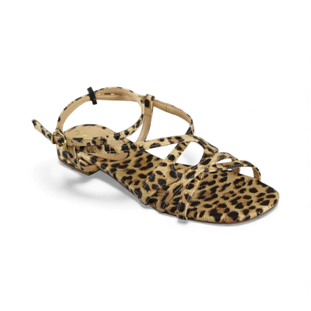 DESCRIÇÃO:Sandália feminina de tiras finas entrelaçadas, com estampa animal print (leopardo) em tons bege e preto. Modelagem aberta, bico levemente quadrado/pontiagudo e tira de tornozelo ajustável por fivela dourada. Salto muito baixo, palmilha forrada na mesma estampa e solado fino. Estilo leve, casual-elegante.