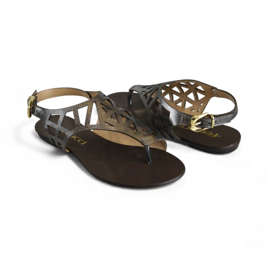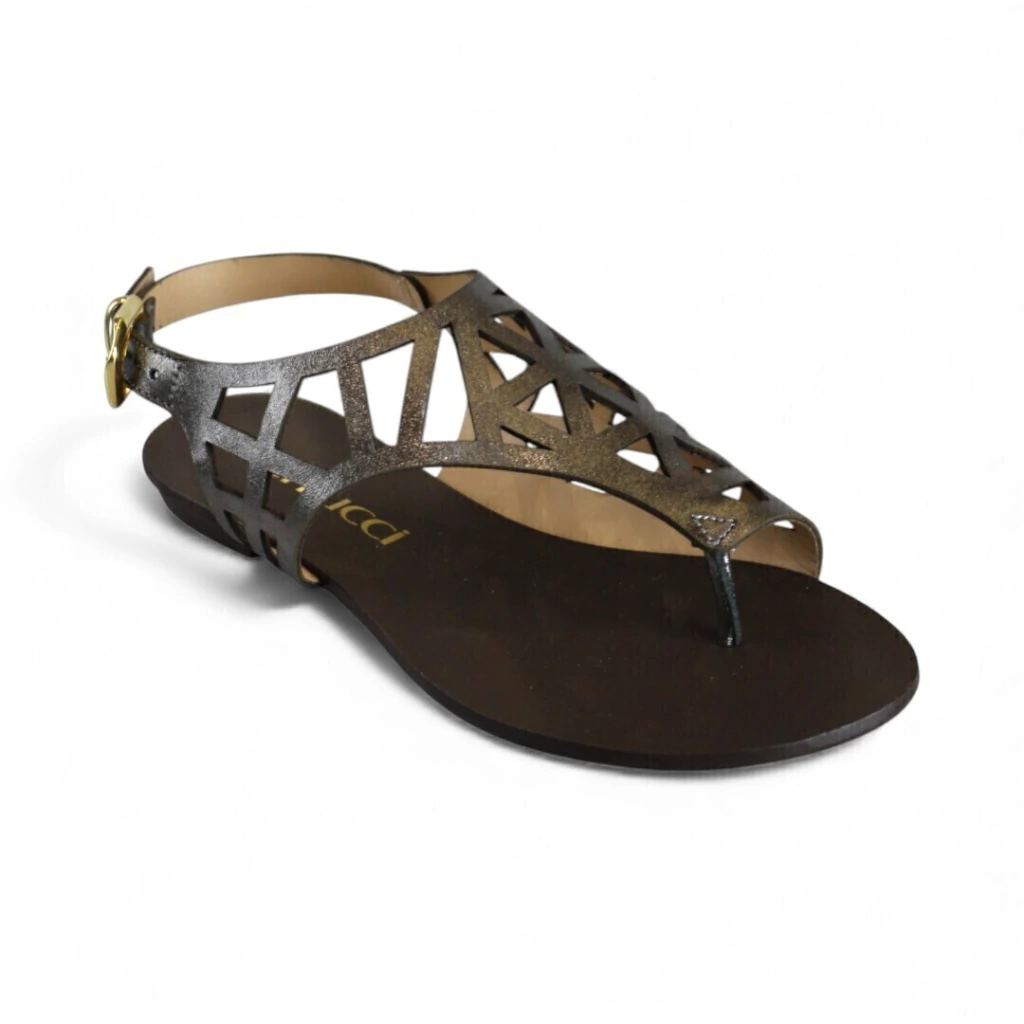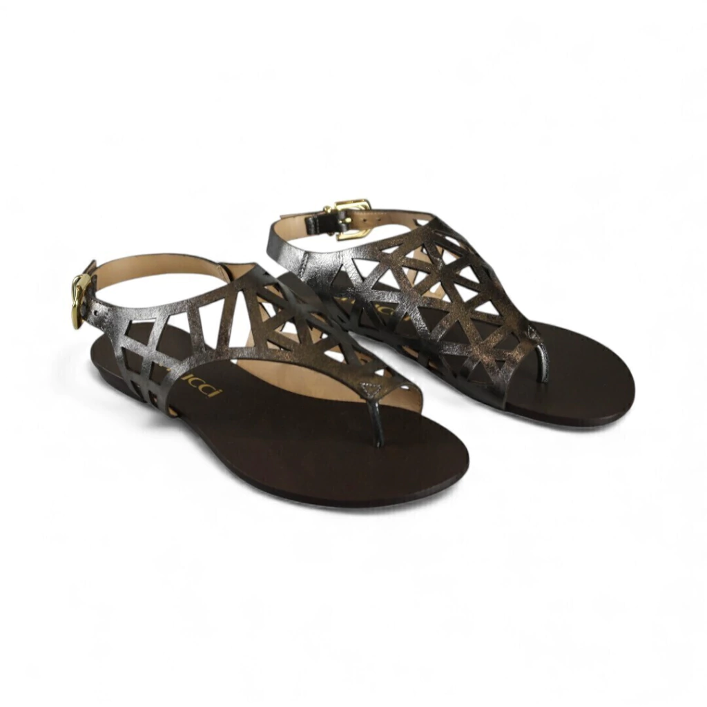 DESCRIÇÃO:Sandália feminina tipo rasteira com tirinha entre os dedos (passador) e tira traseira ajustável por fivela dourada. Cabedal em recorte a laser com padrão geométrico em tom bronze/metálico escuro. Palmilha e solado finos em marrom escuro, salto praticamente reto (muito baixo). Estilo elegante e moderno, apropriado para looks casuais e sociais.