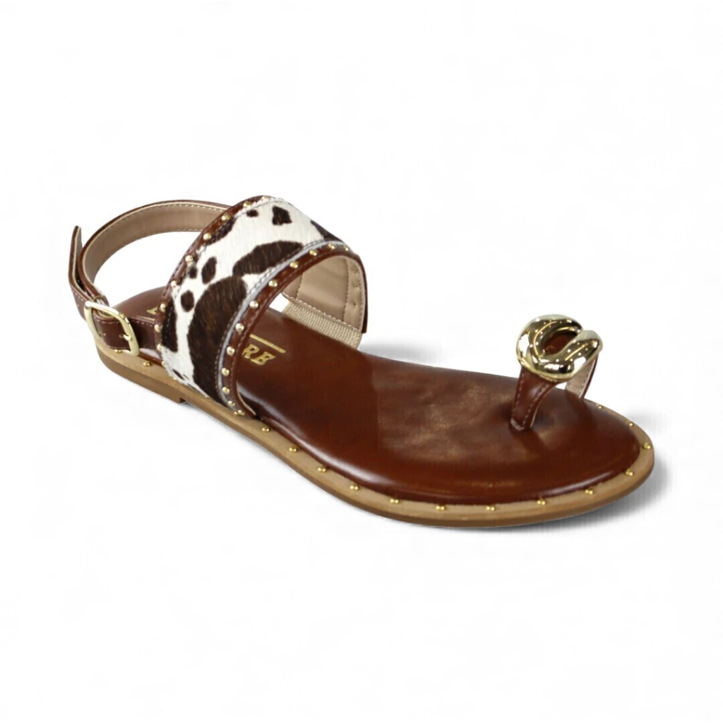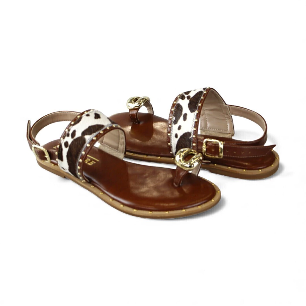 DESCRIÇAO: Sandália feminina rasteira marrom com tira larga sobre o peito do pé em material tipo pelo com estampa animal (manchas em marrom e branco). Possui passador em formato de argola/detalhe dourado no dedão, tira no tornozelo com fivela dourada e palmilha acolchoada marrom. Solado plano com pequenos studs dourados na borda. Visual casual e com toque sofisticado.