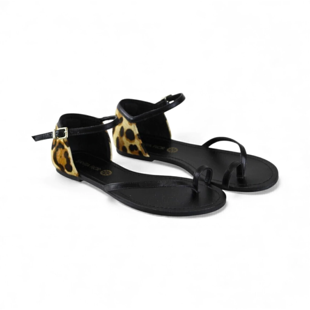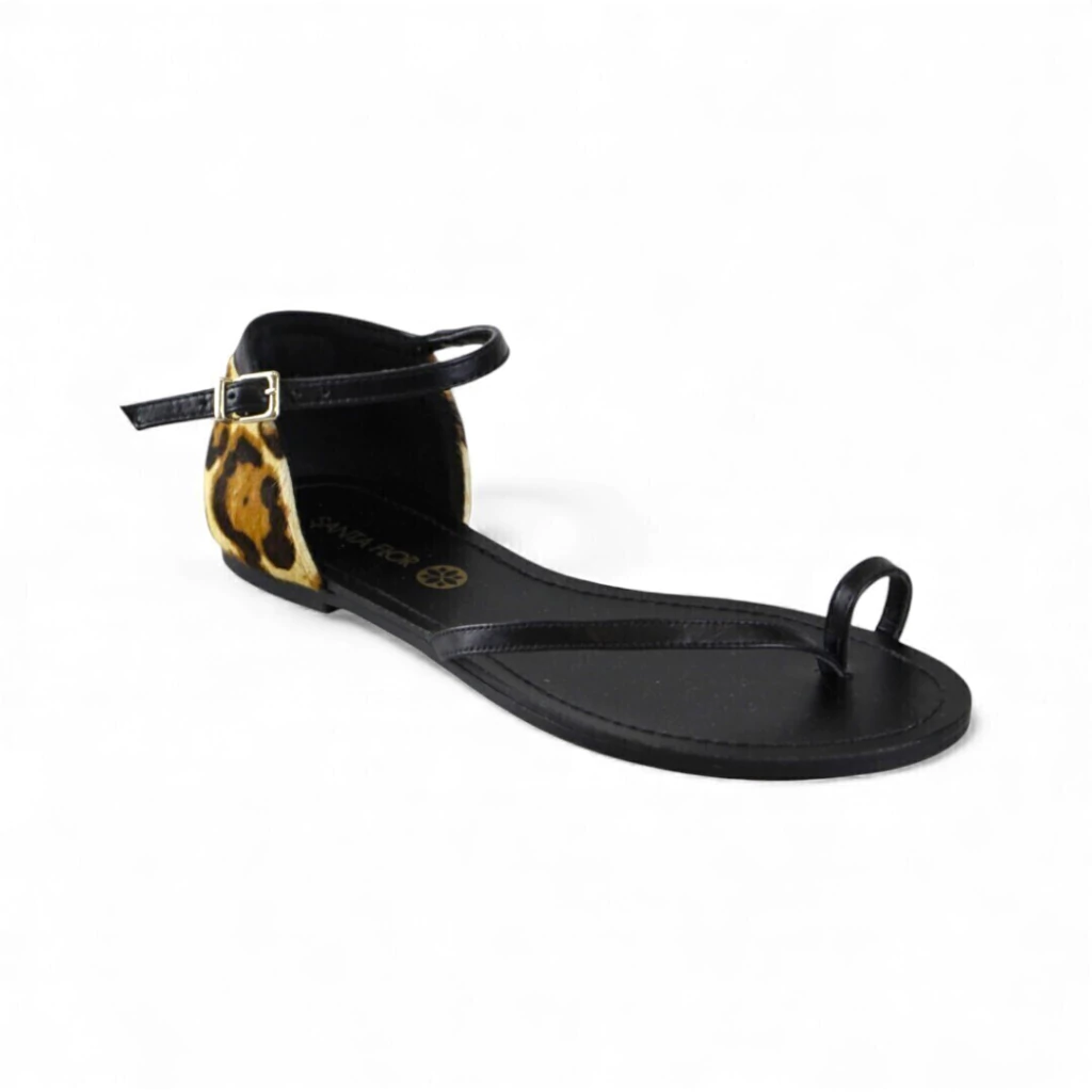 DESCRIÇÃO: Rasteira feminina minimalista em tom preto com tira em “T” fininha e passador entre os dedos (toe loop), tira ajustável no tornozelo com fivela dourada, contraforte traseiro em estampa animal print (onça) com acabamento peludo, palmilha preta e solado baixo e plano.